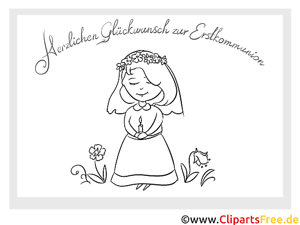 In dieser zauberhaften Malvorlage begegnet man einem Mädchen, das mit einem friedlichen Lächeln dasteht. Es ist zur Erstkommunion angezogen, ein feines weißes Kleid ziert ihren kleinen Körper. Ihre Augen sind sanft geschlossen, was eine friedvolle Atmosphäre erzeugt. In der Hand hält sie eine kleine Kerze, die symbolisch für das Licht und Glauben steht. naja, Um sie herum blühen hübsche Blumen, die die Szene noch lebendiger machen - perfekt für eine Ausmalung! Darüber prangt der Schriftzug „Herzlichen Glückwunsch zur Erstkommunion“, was diese Malvorlage ganz besonders für einen festlichen Anlass macht.