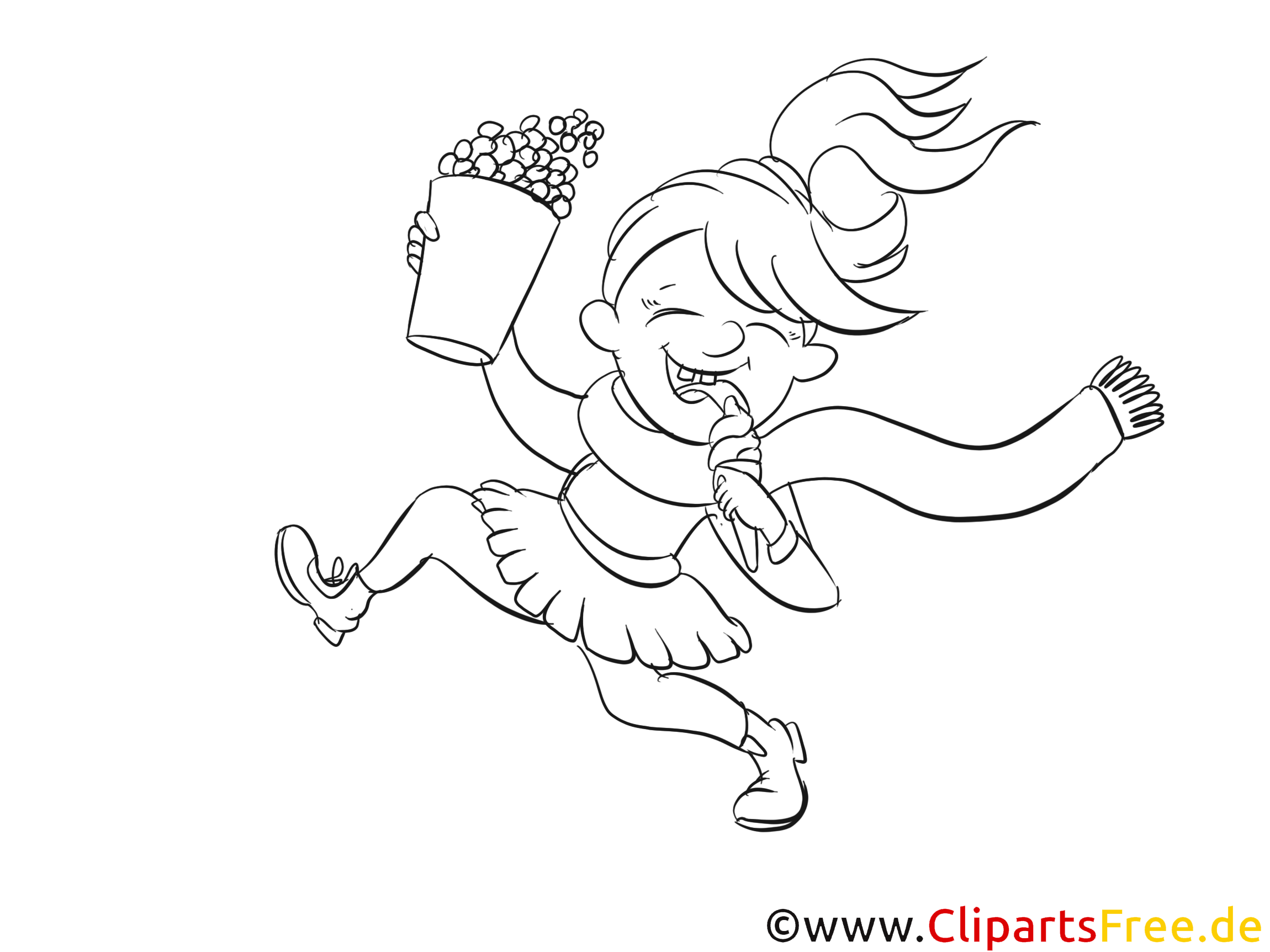 Dieses fröhliche Ausmalbild zeigt ein Mädchen, das mit strahlendem Lächeln tanzt und dabei eine große Tüte Popcorn in der Hand hält. Sie trägt ein hübsches Kleidchen und wirkt überaus lebhaft. Ihre Haare fliegen im Wind. Man kann die Freude förmlich spüren! Es ist, als würde sie im Besaison einer ganz besonderen Feier sein, vielleicht einem Geburtstag oder einem Kinoabend – so richtig schön lässig und mutig einfach!