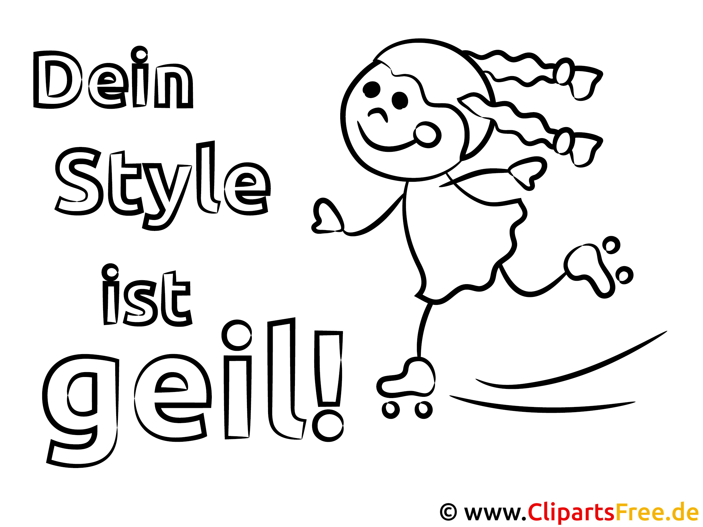 Das Ausmalbild zeigt ein fröhliches, kleines Mädchen, das voller Energie auf ihren Rollschuhen dahingleitet. Ihre Zöpfe fliegen im Wind, und man kann fast die Freude spüren, die sie beim Rollen hat. Um sie herum ist der Text „Dein Style ist geil!“, der motiviert und glücklich macht. Die Skizze ist nicht nur süß, sondern strahlt auch Selbstbewusstsein und Lebensfreude aus – einfach klasse!