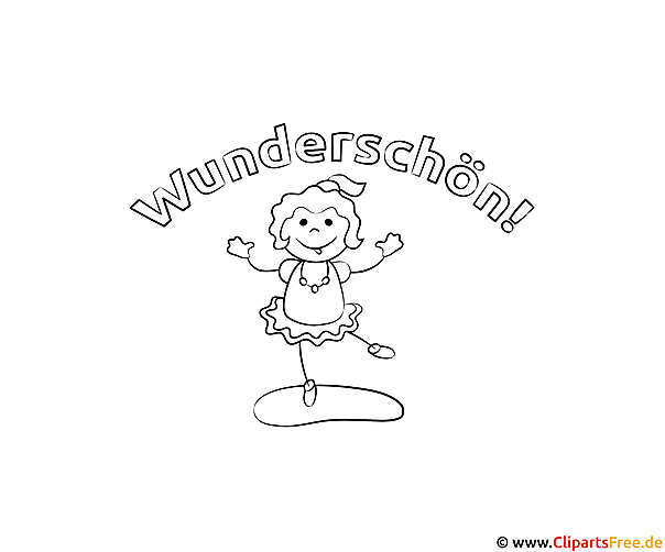 Schau dir dieses fröhliche Malbild an! Es zeigt ein kleines Mädchen, das voller Freude umher hüpft. Ihre Haare wehen im Wind, und ihr Gesicht strahlt pure Begeisterung aus. Außerdem trägt sie ein süßes Kleid mit Rüschen – einfach zauberhaft! Und ganz oben steht das Wort „Wunderschön!“ in großen bunten Buchstaben, was den Einsatz von Farbe sofort einlädt. Eine echte Vorlage zum Ausmalen, die gute Laune verbreitet!
