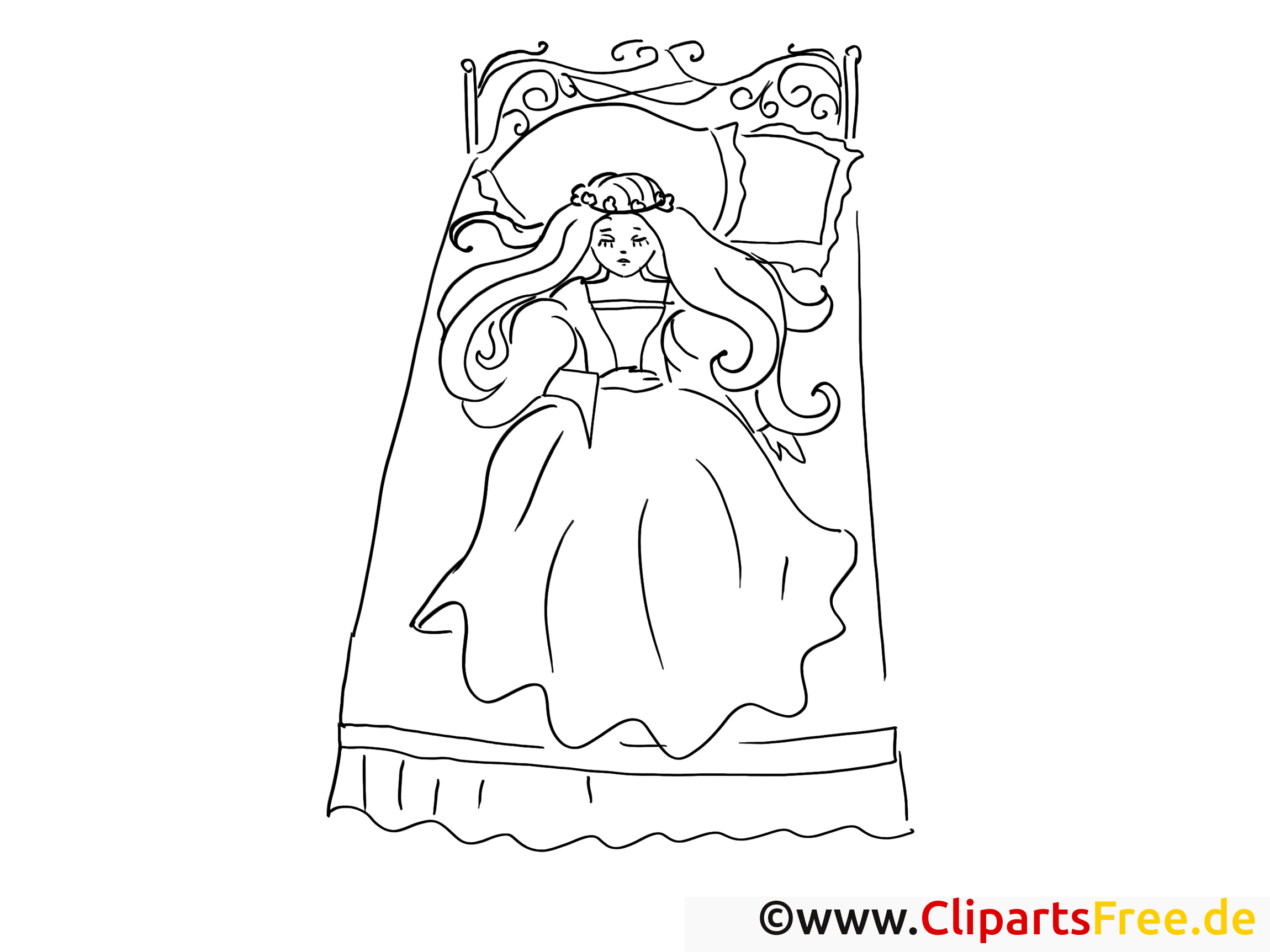 Der Stil des Bildes ist einfach, aber detailverliebt. An den Haaren sind feine Strichlinien erkennbar, die Tiefe erzeugen. Auch das Bett ist mit filigranen Verzierungen geschmückt, die einen Hauch von Eleganz ins Bild bringen. Der ungezwungene Strich vermittelt eine gewisse Leichtigkeit, die dazu einlädt, kreativ zu werden. Die klaren Linien machen es einfach, die Malvorlage genau auszumalen – das ist entscheidend für Spaß und Freude beim Malen. weißt du, Die vielen Details können kleine Künstler herausfordern und begeistern.