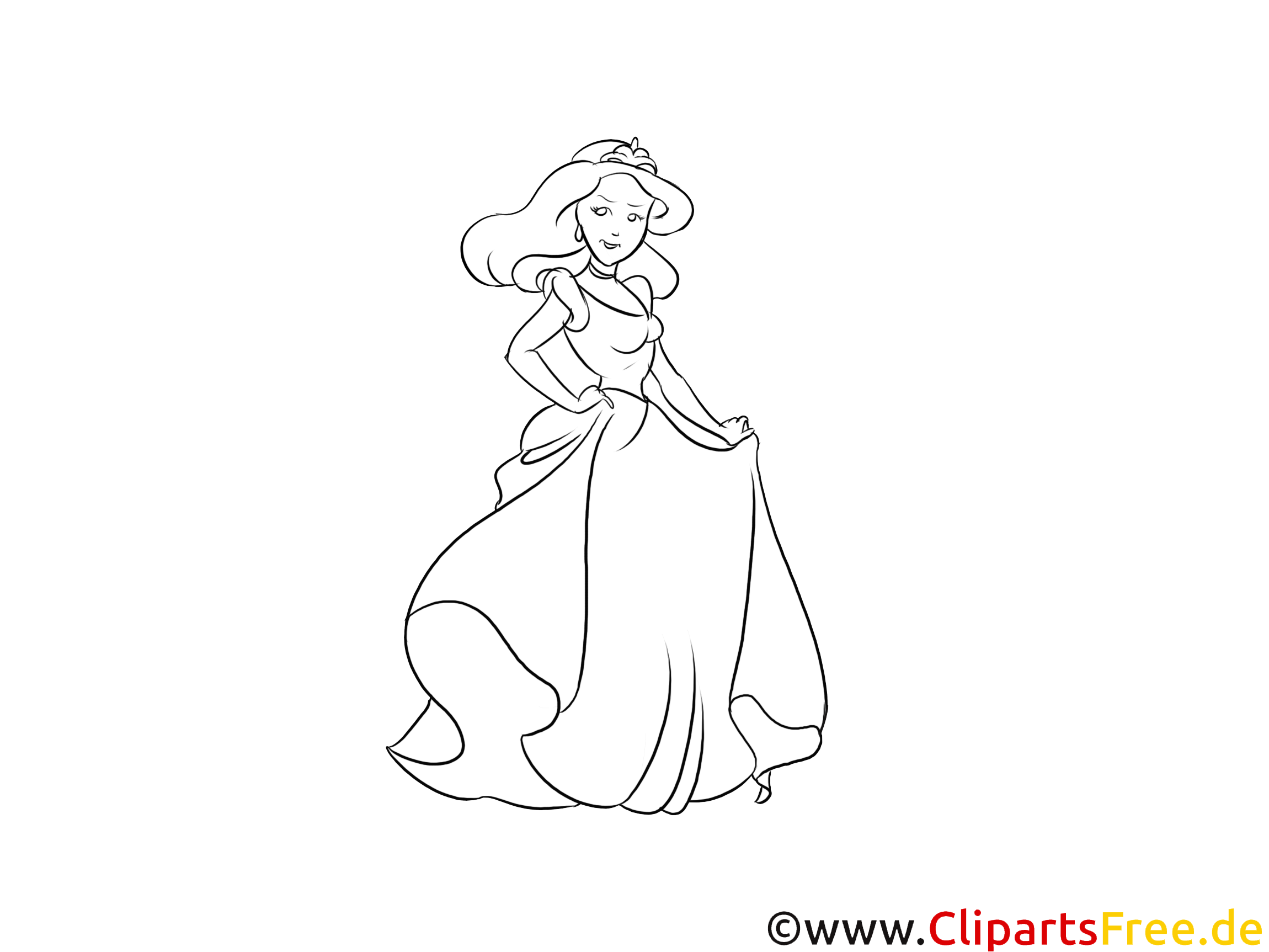 Das Ausmalbild zeigt eine elegante Prinzessin, die in einem wunderschönen, langen Kleid posiert. Sie steht mit einem selbstbewussten Lächeln da, und ihr Haar fließt sanft über die Schultern. Das Kleid hat weiche Volants, die fast dazu einladen, mit bunten Farben ausgewählt zu werden. Man könnte sich fragen, wo sie wohl hinwendet – vielleicht zu einem Ball oder in einen zauberhaften Garten? Es gibt viele Details, wie die kleine Schleife an ihrem Kopf, die das Bild besonders zauberhaft macht. also,