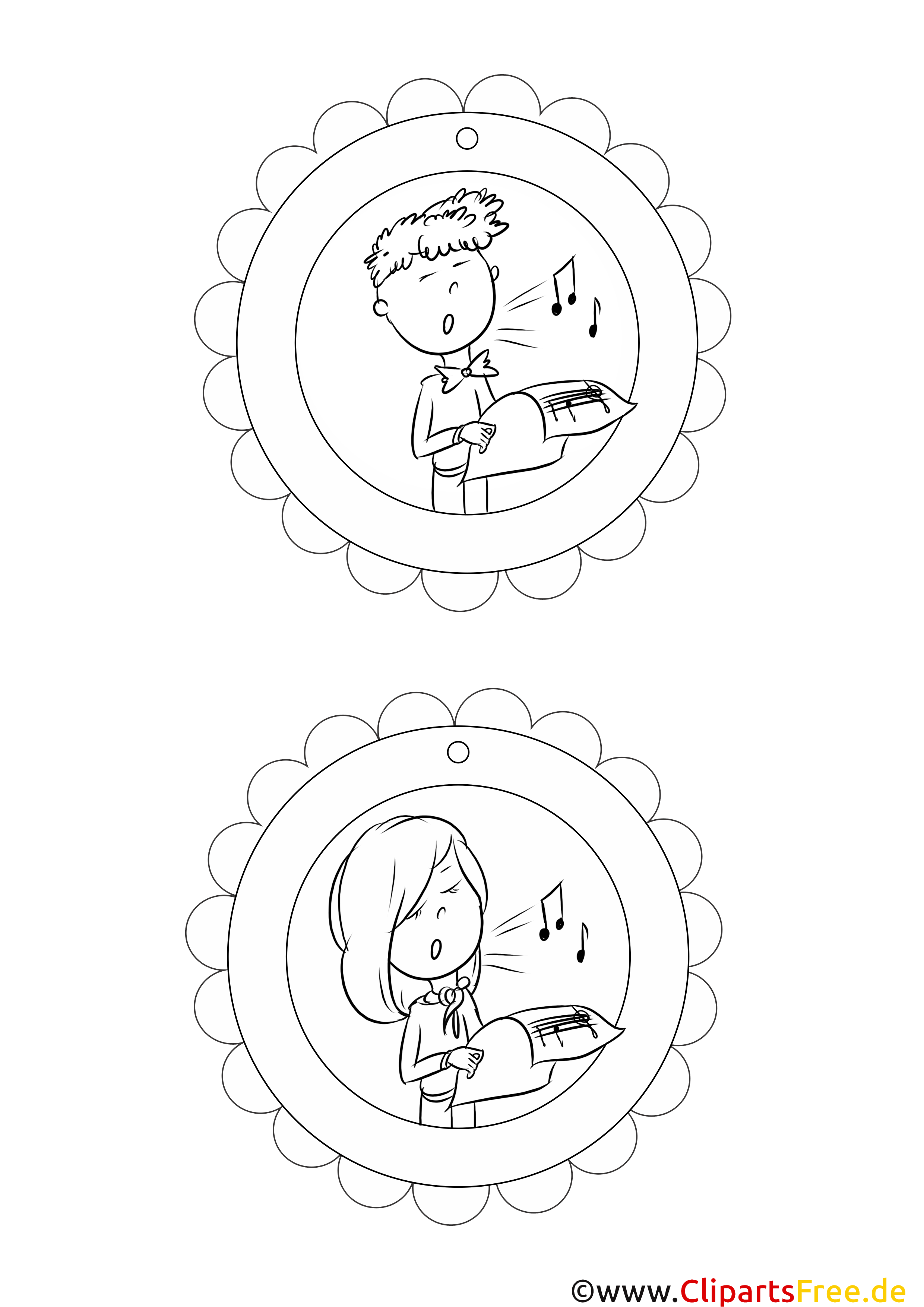 In diesem hübschen Ausmalbild siehst du zwei singende Kinder. Oben ist ein Junge mit einer kurzen Frisur, der gerade ganz begeistert und voller Freude in sein Notenheft schaut. Unten ist ein Mädchen, die ebenfalls mit einem strahlenden Gesicht singt und ein Lied für alle darbietet. Beide haben farbenfrohe Noten um sich herum, die das Bild lebendig machen. Man kann förmlich die Musik hören! Das Motiv hat einen runden Rahmen, der es besonders schick macht … .