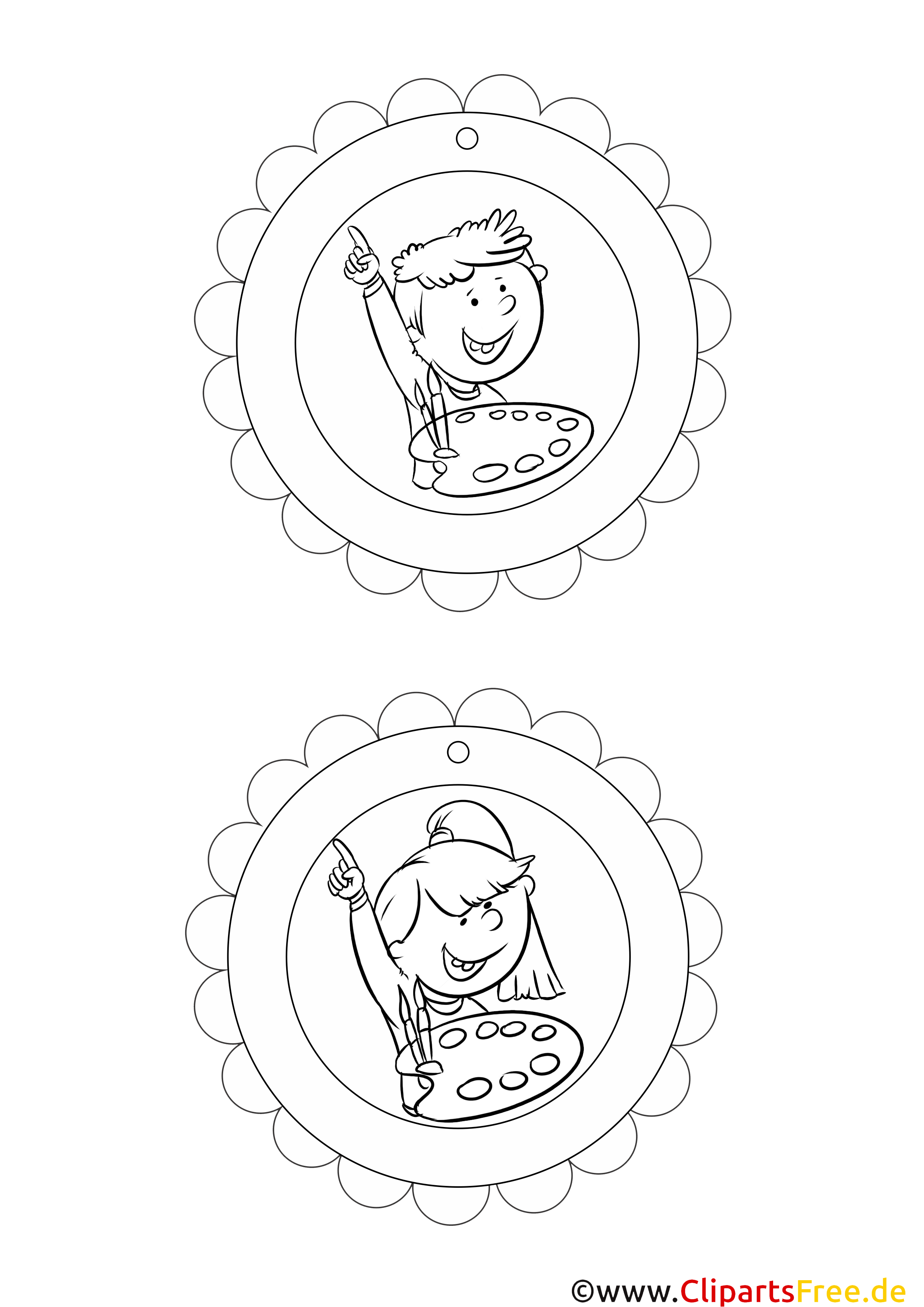 In dieser Malvorlage findet man zwei fröhliche Kinder, die begeistert beim Malen sind. Der Junge oben zeigt mit einem Finger nach oben, als hätte er eine großartige Idee. Mit seinen bunten Farben auf der Palette strahlt er pure Freude aus. Das Mädchen darunter hat ebenfalls einen Pinsel in der Hand und grinst ganz breit. Beide scheinen voller Kreativität zu stecken, während sie mit ihrem künstlerischen Ausdruck spielen. tja, Die runde Form um die Figuren sorgt dafür, dass das Bild perfekt aussieht, egal ob man es an die Wand hängen oder ins Bilderbuch kleben möchte.
