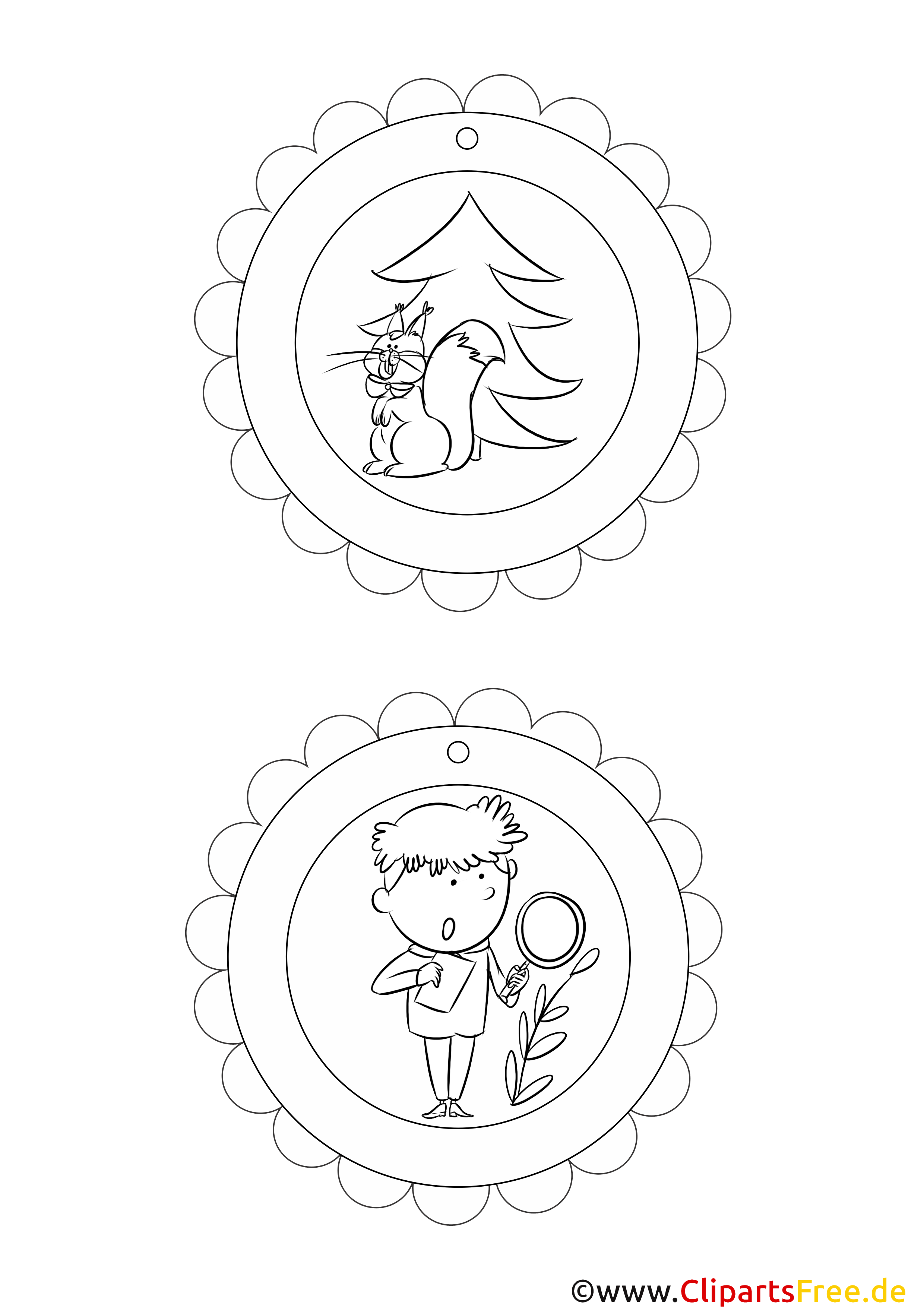 Das Bild zeigt zwei charmante Szenen, die Spaß und Kreativität anregen. Oben sehen wir einen kleinen Kater, der neugierig um einen großen, saftigen Tannenbaum schleicht. Die Szene strahlt eine gewisse Lebensfreude aus, und die Einfachheit macht es super einladend für kleine Künstler. Unten ist ein Junge abgebildet, der in der Hand eine Lupe hält und voller Entdeckungsfreude eine Blume betrachtet. Diese Motive laden zum Träumen ein, und es gibt so viel, was man mit Farben daraus machen kann.
