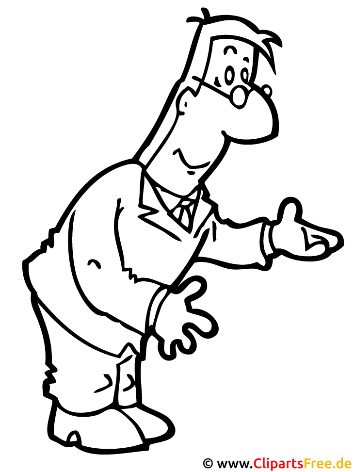 Dieses witzige Ausmalbild zeigt einen freundlichen Mann, der mit einer einladenden Geste die Arme ausbreitet. Er trägt einen klassischen Anzug mit einer Krawatte und ist mit einer Brille versehen – das gibt ihm einen klugen Ausdruck. Ein Lächeln ziert sein Gesicht, und man hat fast das Gefühl, dass er etwas ganz Spannendes erzählt oder eine Einladung ausgesprochen hat. Der Charakter wirkt einladend und fröhlich – perfekt zum Ausmalen!