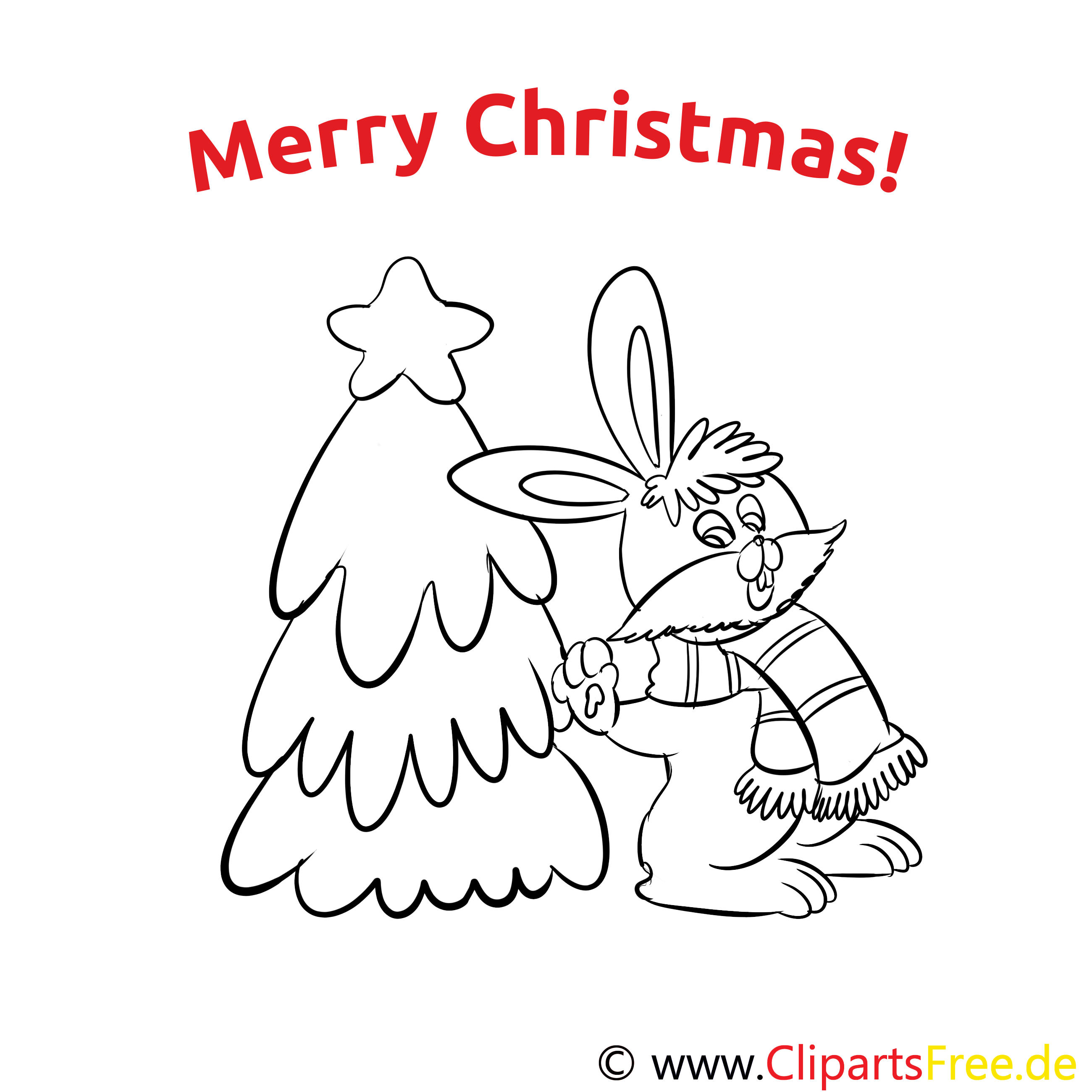 Kostenloses Ausmalbild Hase vor Weihnachtsbaum als PDF Malvorlage