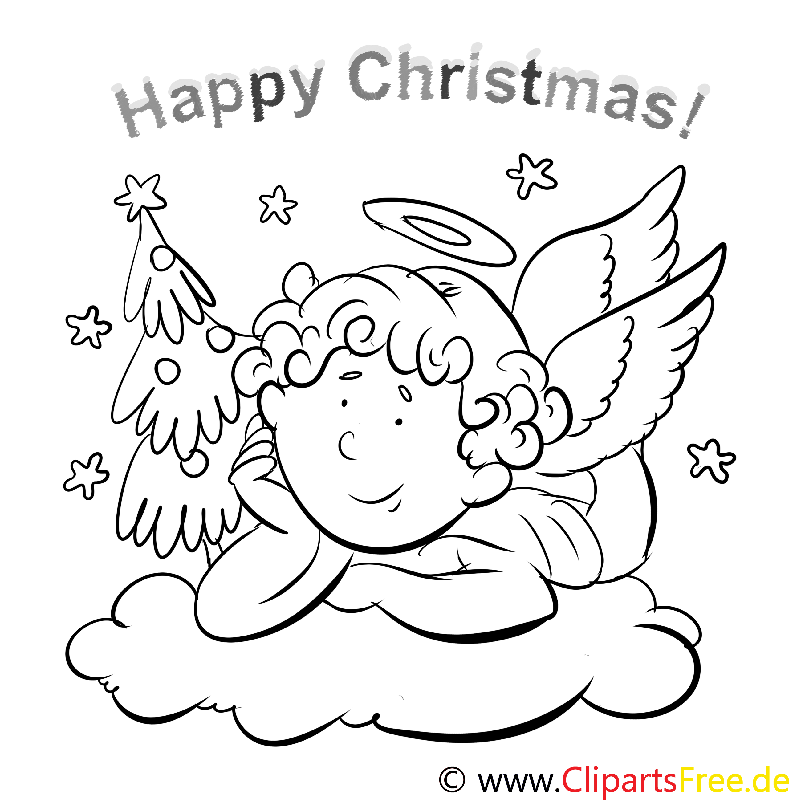 Hier haben wir ein ganz zauberhaftes Bild zum Ausmalen: ein süßer Engel mit lockigen Haaren und einem großen, fröhlichen Gesicht. Er liegt entspannt auf einer Wolke und schaut verträumt in die Luft. Neben ihm steht ein hübscher Weihnachtsbaum, der schon auf das bevorstehende Fest anspielen könnte. Der Schriftzug „Happy Christmas!“ oben rundet das Motiv perfekt ab. Eine festliche Atmosphäre, die Kinderherzen höher schlagen lässt!