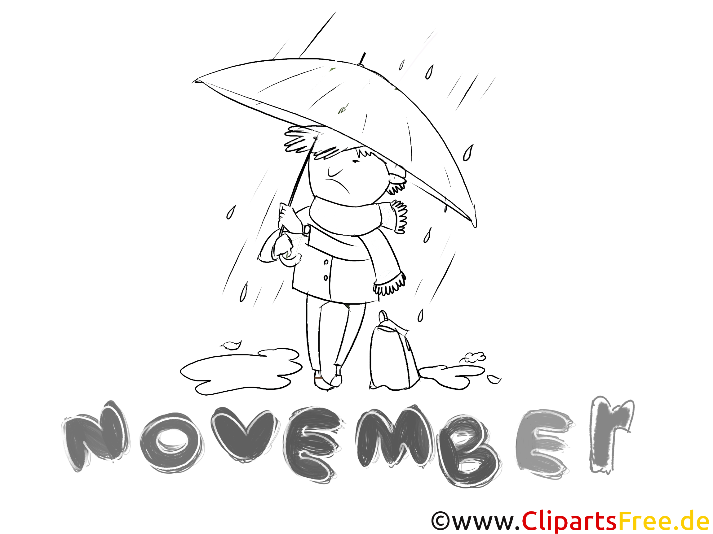Das Motiv zeigt ein kleines Kind, das bei Regenwetter mit einem großen Regenschirm steht. Die kleinen Wassertropfen fallen fleißig vom Himmel und sammeln sich in einer Pfütze, die direkt vor dem Kind liegt. Es ist in einem warmen Mantel gekleidet und hat einen gemütlichen Schal um den Hals. Man spürt fast das nasse Wetter, nicht wahr? Und irgendwie sagt der Gesichtsausdruck des Kindes, dass es den Regen zwar nicht mag, aber trotzdem etwas Abenteuerliches darin sieht. Die Schrift darunter, die das Wort "NOVEMBER" in dicken, verspielten Buchstaben zeigt, passt perfekt zur herbstlichen Stimmung.