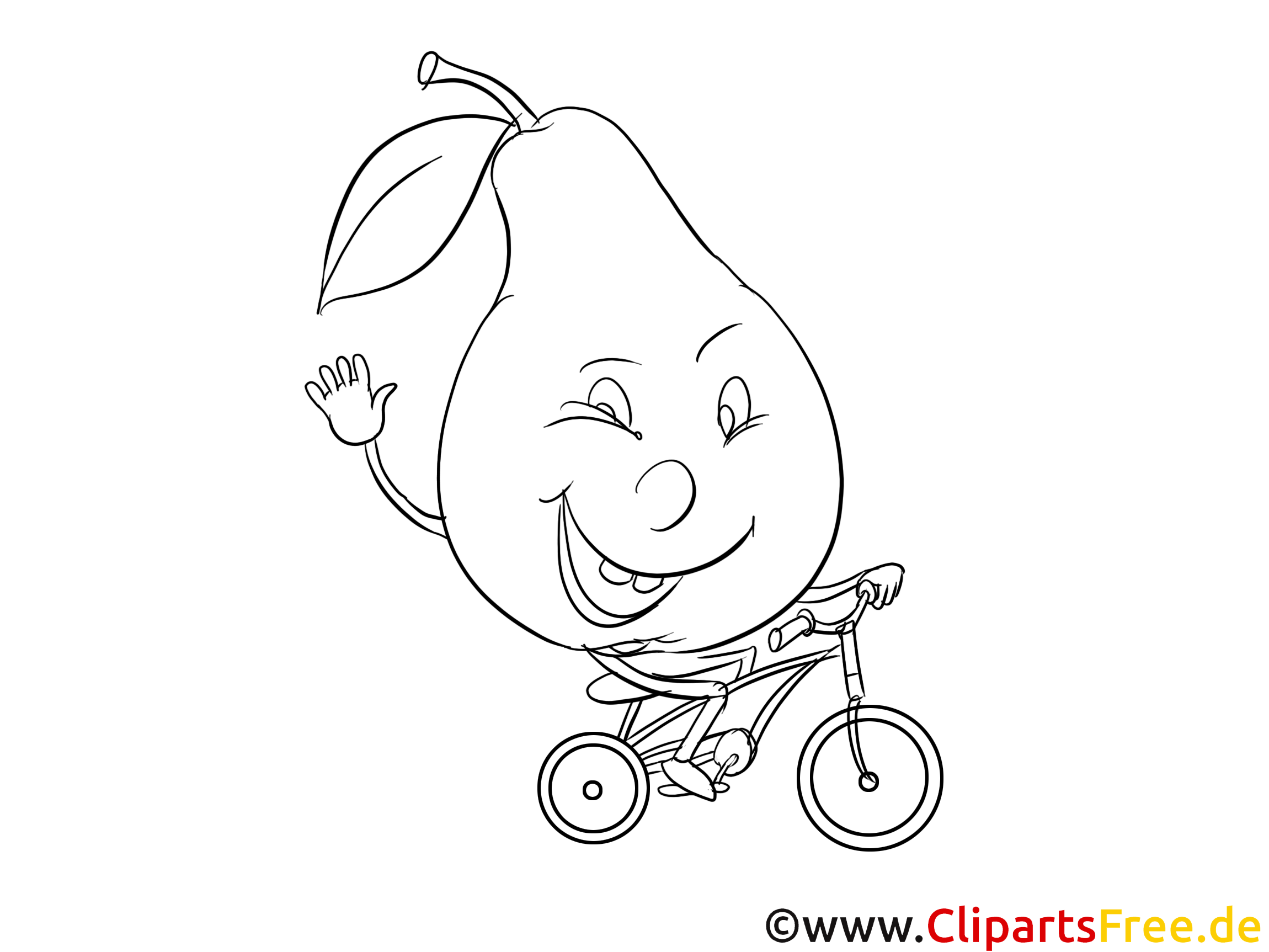 Kostenloses Ausmalbild einer fröhlichen Birne auf Fahrrad als PDF
