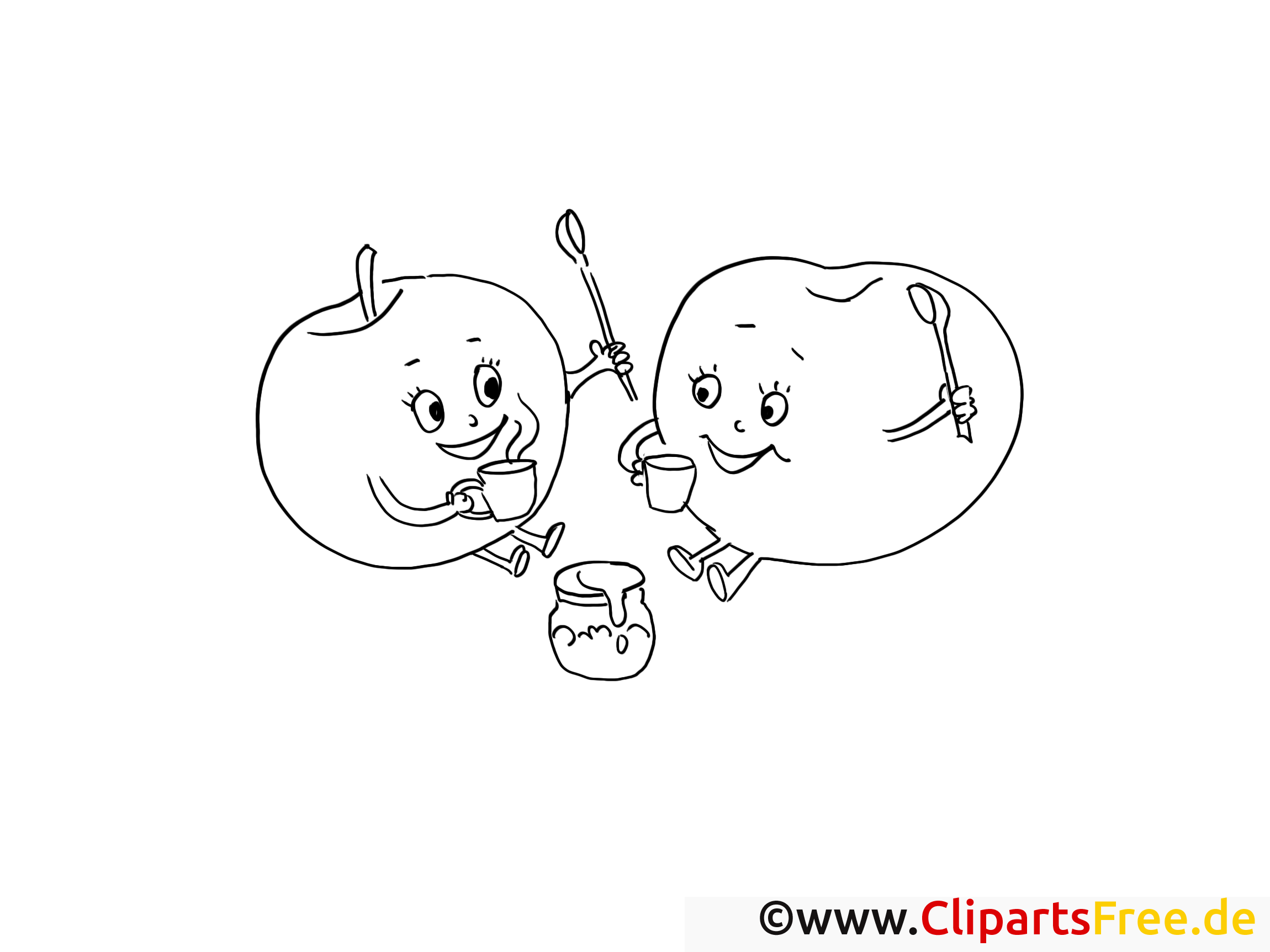 In diesem fröhlichen Ausmalbild sieht man zwei liebevoll gestaltete Früchte – einen Apfel und eine Birne, die es sich richtig gemütlich machen. Sie sitzen zusammen, plaudern, und beide haben ein kleines Glas, jeweils mit einem Löffel in der Hand. Man könnte fast hören, wie sie zusammen lachen! In der Mitte steht ein Honigglas, das einen zusätzlichen süßen Touch hinzufügt. Diese beiden sind einfach niedlich und verbreiten gute Laune, egal ob man sie ausmalt oder einfach nur anschaut.