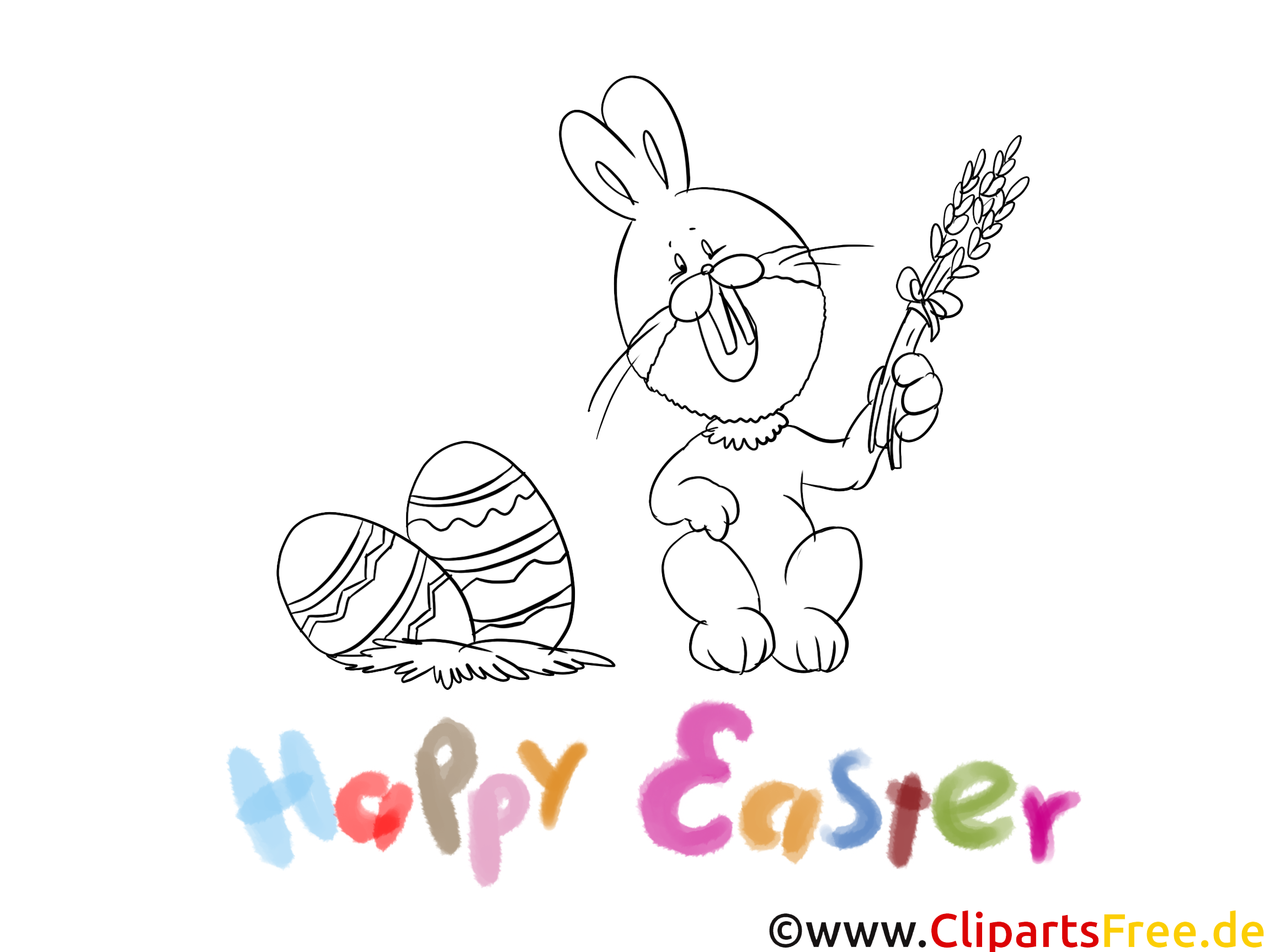 Hier sehen wir einen fröhlichen Osterhasen. Der Hase hält einen kleinen Zweig in der Hand und wirkt ganz begeistert. Neben ihm liegen einige bunte Ostereier, die darauf warten, von kleinen Künstlerhänden bemalt zu werden. Ob rot, blau, grün oder gelb – die Farben sind echt toll! Und darunter steht auch noch "Happy Easter" in bunten Buchstaben. Richtig fröhlich, oder?