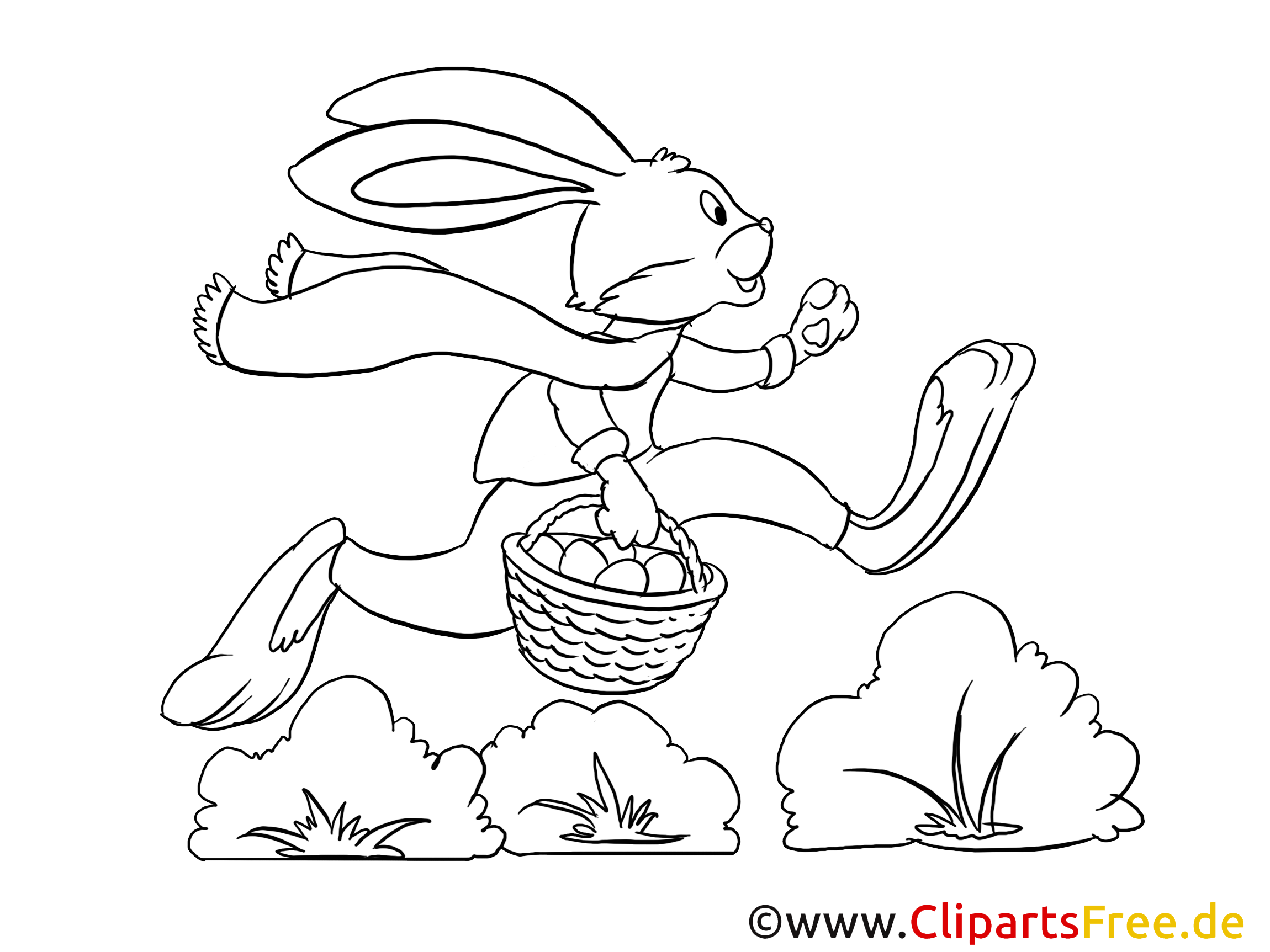 Hier hast du ein richtig tolles Bild zum Ausmalen! Es zeigt einen fröhlichen Hasen, der ganz eilig mit einem Korb voller bunter Eier durch die Landschaft rennt. So ein Osterhase! Der Wind bläst ihm, wie man sieht, das schöne Tuch um den Hals – das fliegt richtig! Er ist auf der Jagd, eh schon klar, und genau das macht das Bild so lebendig. Die kleinen Büsche im Hintergrund setzen dem Ganzen noch das Tüpfelchen auf dem i. Einfach ideal für kreative Köpfe!