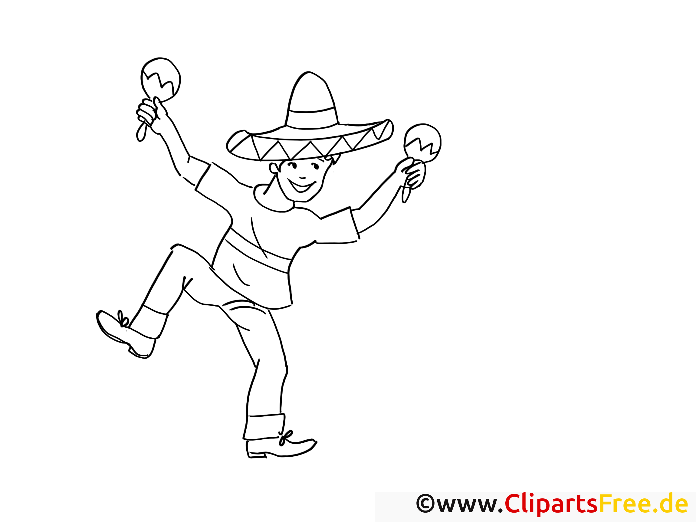 Hier haben wir ein super fröhliches Motiv, naja, man könnte sogar sagen, es ist ein richtig lebhaftes Malbild! Der Junge, der einen bunten Sombrero trägt, tanzt voller Freude mit zwei Maracas in der Hand. Man sieht ihm die Begeisterung direkt an, oder? Was für eine tolle Szene - ein richtig kleiner Wirbelwind, der gerade so in Bewegung ist, als würde er mit jedem Schritt Musik ins Spiel bringen! Echt lustig, oder? Übrigens, die Details im Bild machen das Ausmalen besonders spannend.