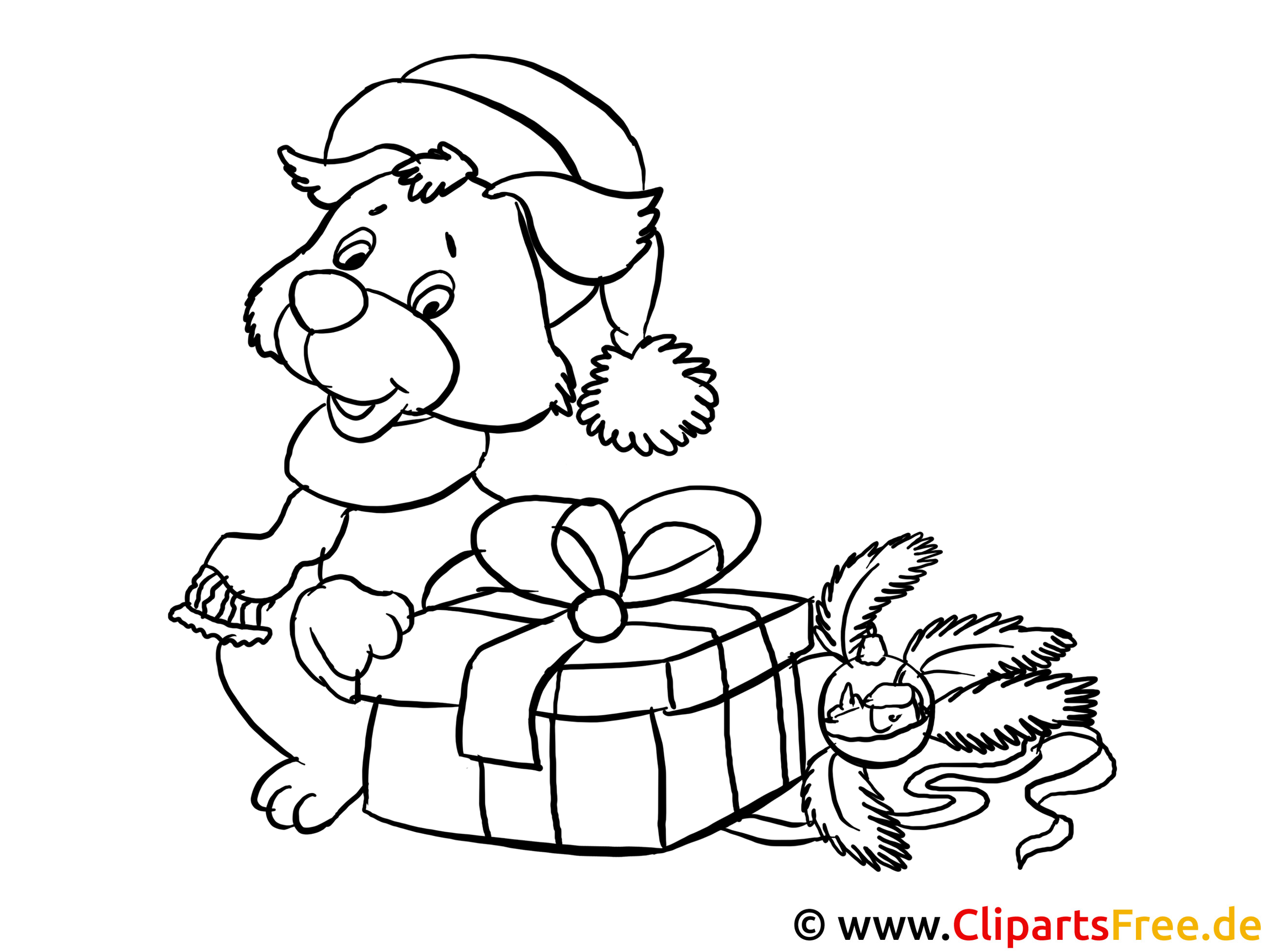 Original-Bild: Kostenloses Ausmalbild Hund mit Geschenk – Malvorlage im PDF
