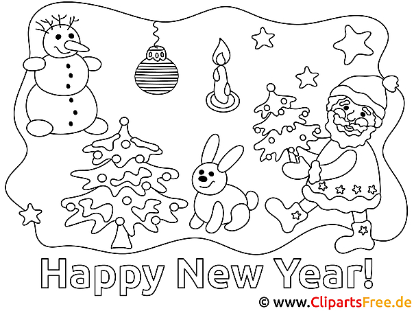 Freuen wir uns auf das neue Jahr! Dieses Ausmalbild ist voller Spaß und Freude. Ein fröhlicher Schneemann mit einer Karottennase und einem verschmitzten Lächeln steht da und genießt die winterliche Stimmung. Umgeben von grünen Tannen, die lieblich geschmückt sind, sieht man sogar einen süßen kleinen Hasen, der neugierig zwischen den Bäumchen sitzt. Und da ist auch der Weihnachtsmann! Staunend leuchtet er seine roten und weißen Farben aus, bereit richtige Wunder für das neue Jahr zu bringen. sozusagen, Über all dem prangt der Schriftzug „Happy New Year!“, der dazu einlädt, das Bild zum Ausmalen individuell zu gestalten.