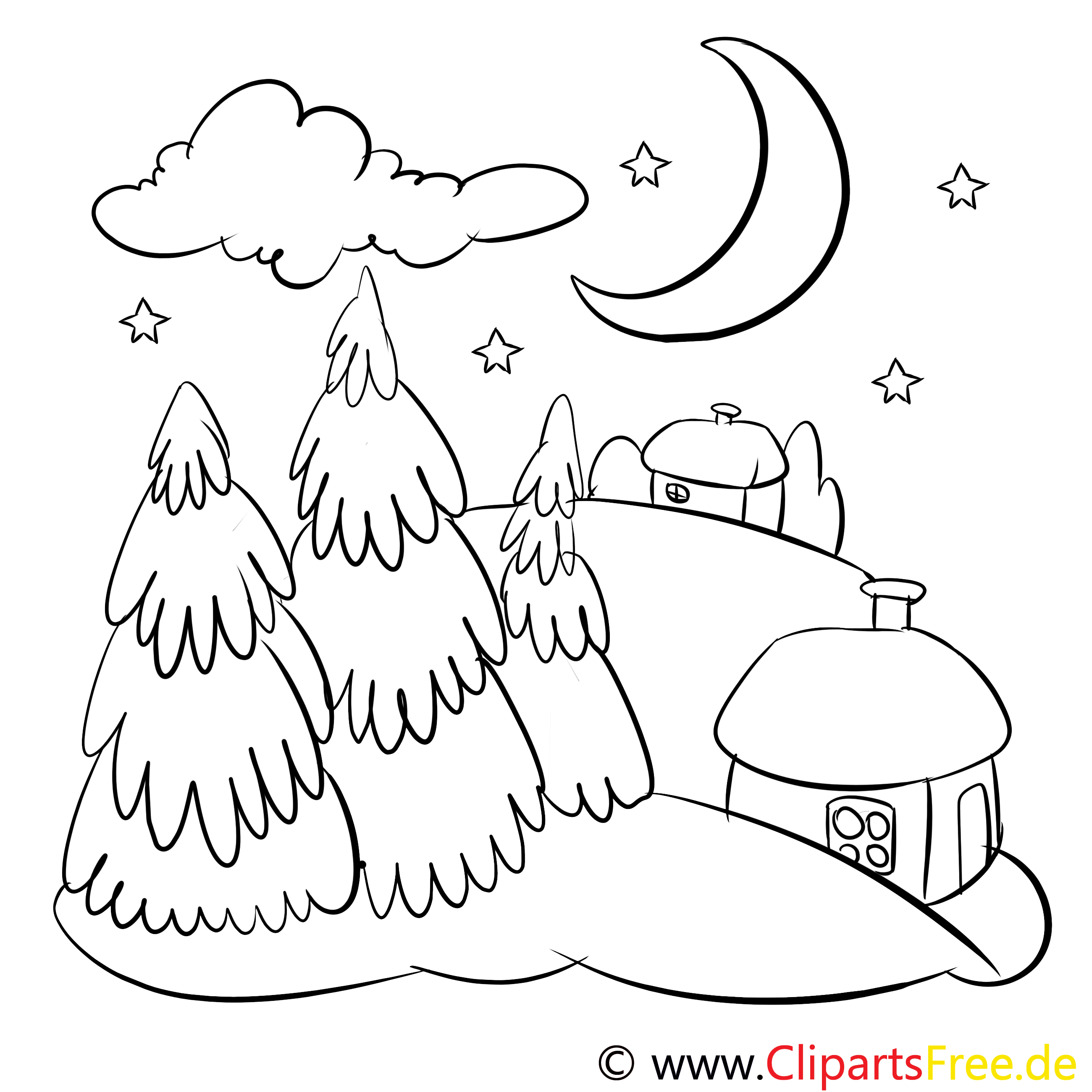 Kostenloses Ausmalbild Mondnacht mit Hütte – PDF Malvorlage gratis