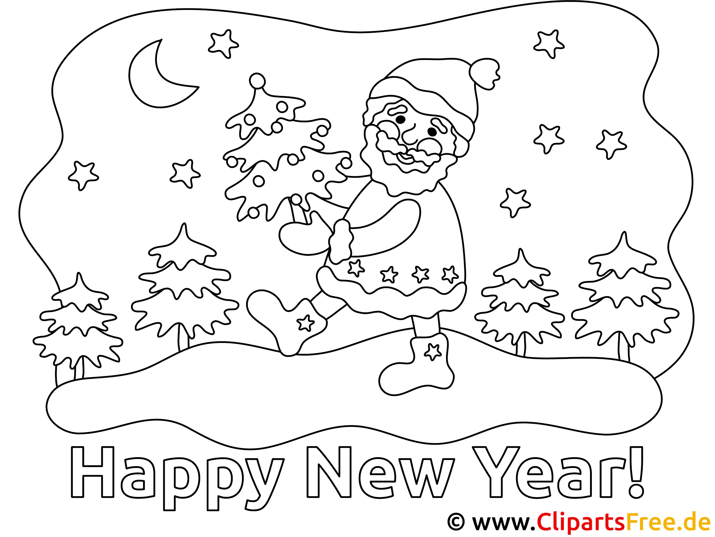 Das Ausmalbild zeigt einen fröhlichen Weihnachtsmann, der mit einem kleinen Weihnachtsbaum in der Hand über die verschneite Winterlandschaft schlendert. Der lustige Zottelbart, die warme Mütze und die dicken, lustigen Stiefel sorgen für eine gemütliche Stimmung. Die schneebedeckten Tannen im Hintergrund und der glitzernde Mond am Himmel machen die Szene so richtig zauberhaft. Ein paar Sterne funkeln am Himmel – einfach herrlich! Inmitten dieses besinnlichen Motives steht in großen Buchstaben „Happy New Year!“. Es lädt regelrecht dazu ein, die Farben zum Leben zu erwecken.