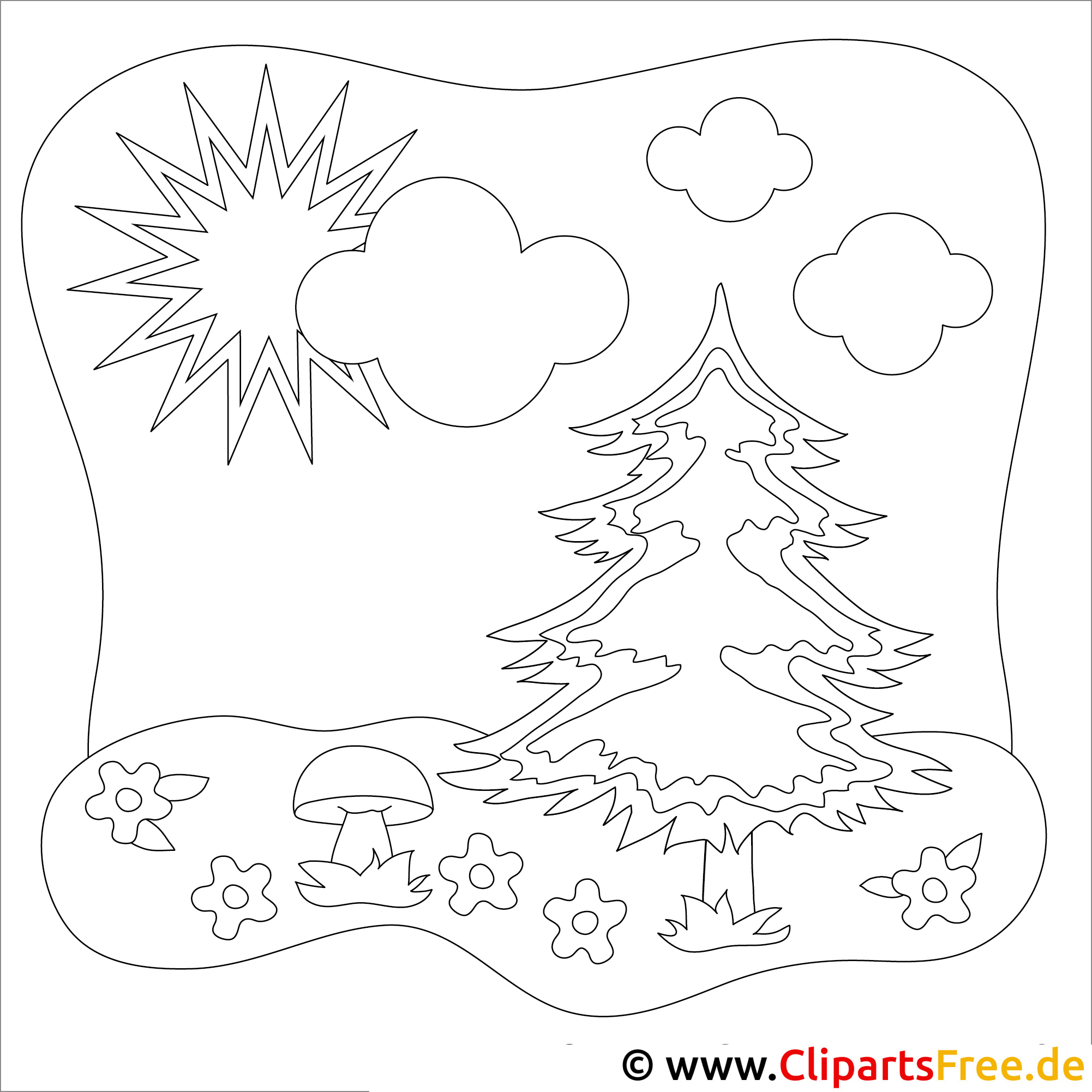 In diesem wunderbaren Ausmalbild, wow, das ist echt hübsch! Da gibt es einen großen Tannenbaum, der stolz in der Mitte steht. Drumherum blühen kleine, bunte Blümchen und ein niedlicher Pilz für die Freunde von der Natur. Das Bild wird von sanften Wolken und einer strahlenden Sonne umgeben, echt einladend, oder? Ideal für kreative Auszeiten, um die Fantasie sprießen zu lassen.