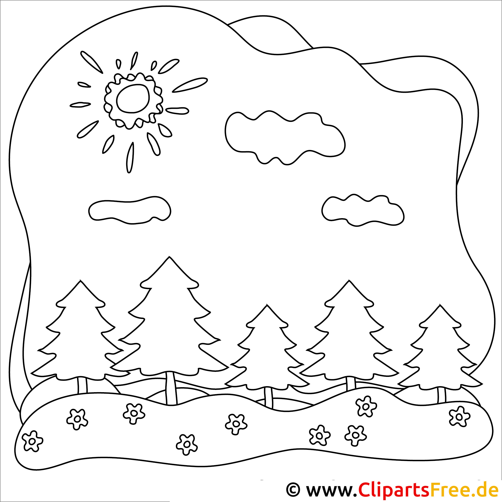 Das Ausmalbild zeigt eine einfache, aber fröhliche Landschaft. Man sieht hohe, grüne Tannenbäume, die fast schon wie Wächter der Natur wirken. Übrigens gibt’s auch ein paar hübsche Blumen, die fröhlich am Boden wachsen. Über dieser Szene blinzelt die Sonne, und einige weiche Wolken schweben am Himmel. Es ist wirklich ein Bild für die Seele!