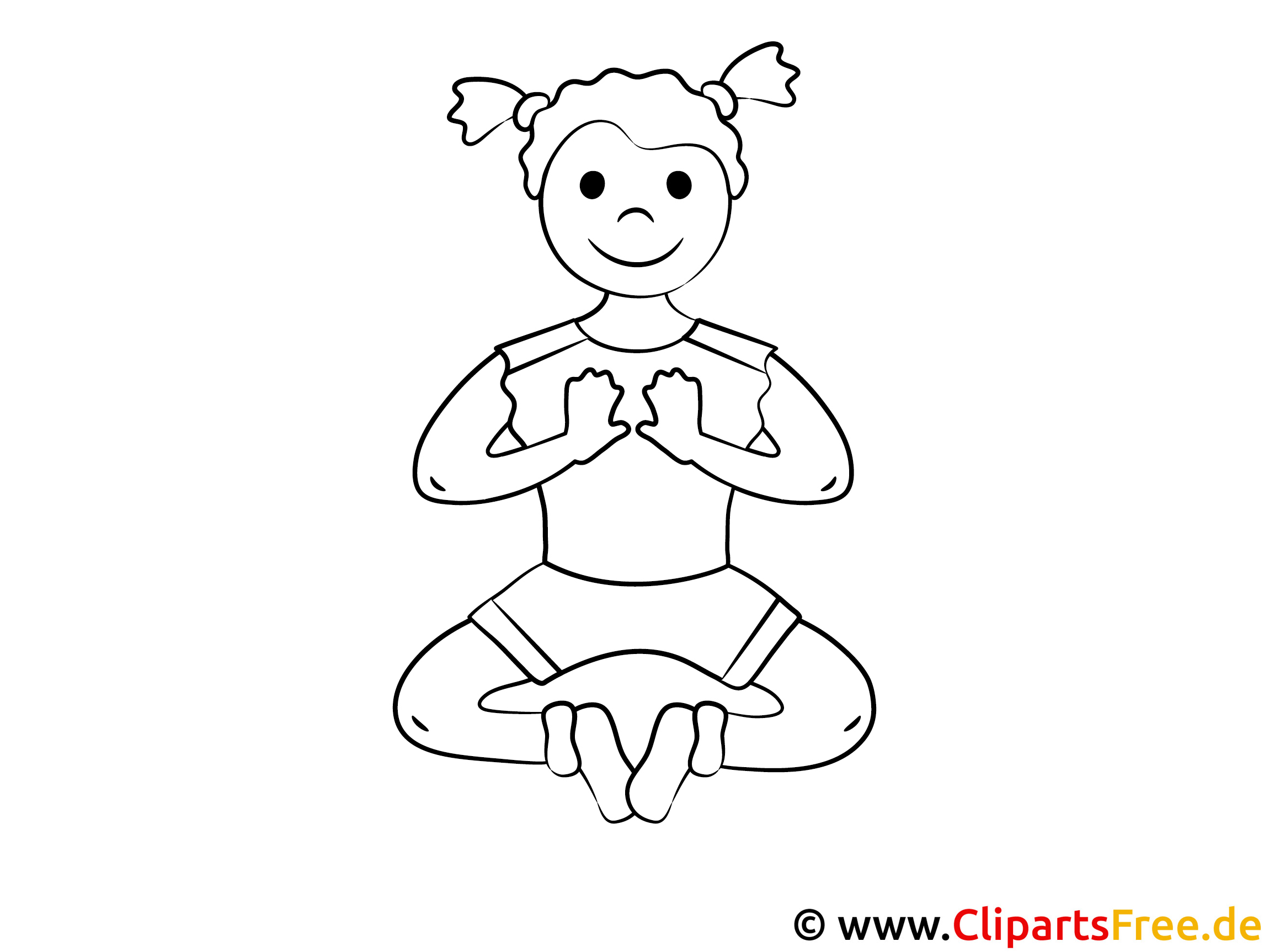 Das Bild zeigt ein fröhliches, kleine Mädchen, das in einer entspannten Yogahaltung sitzt. Mit den Beinen verschränkt und die Hände vor der Brust, wirkt sie ganz konzentriert und glücklich. Ihre Zöpfe springen förmlich vor Freude, als ob sie der Welt ganz positiv gegenübersteht. Der strahlende Gesichtsausdruck lädt dazu ein, selbst ein wenig inneren Frieden zu finden und vielleicht die eigene kreative Ader beim Ausmalen zu entdecken. So eine Malvorlage, nicht wahr?