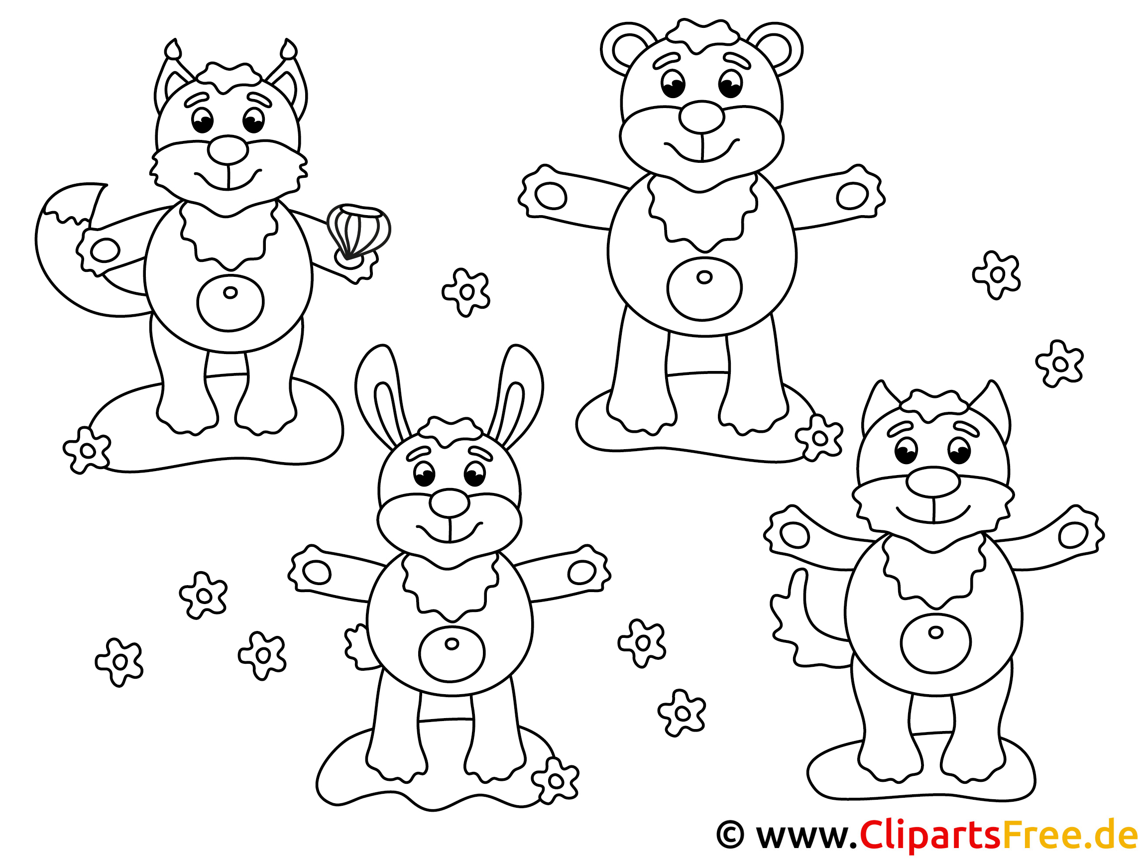 In dieser tollen Ausmalvorlage sind vier niedliche Tiere abgebildet! Da ist ein schelmischer Fuchs mit einem bunten Ballon, ein fröhlicher Bär, ein ganz süßes Kaninchen und ein strahlender Hund. Jedes Tier hat seine eigene charmante Pose, die einfach zum Lachen anregt. Um sie herum sind kleine Blümchen verteilt – wie schön ist das denn! Die Motive locken auf jeden Fall Groß und Klein zum Ausmalen!