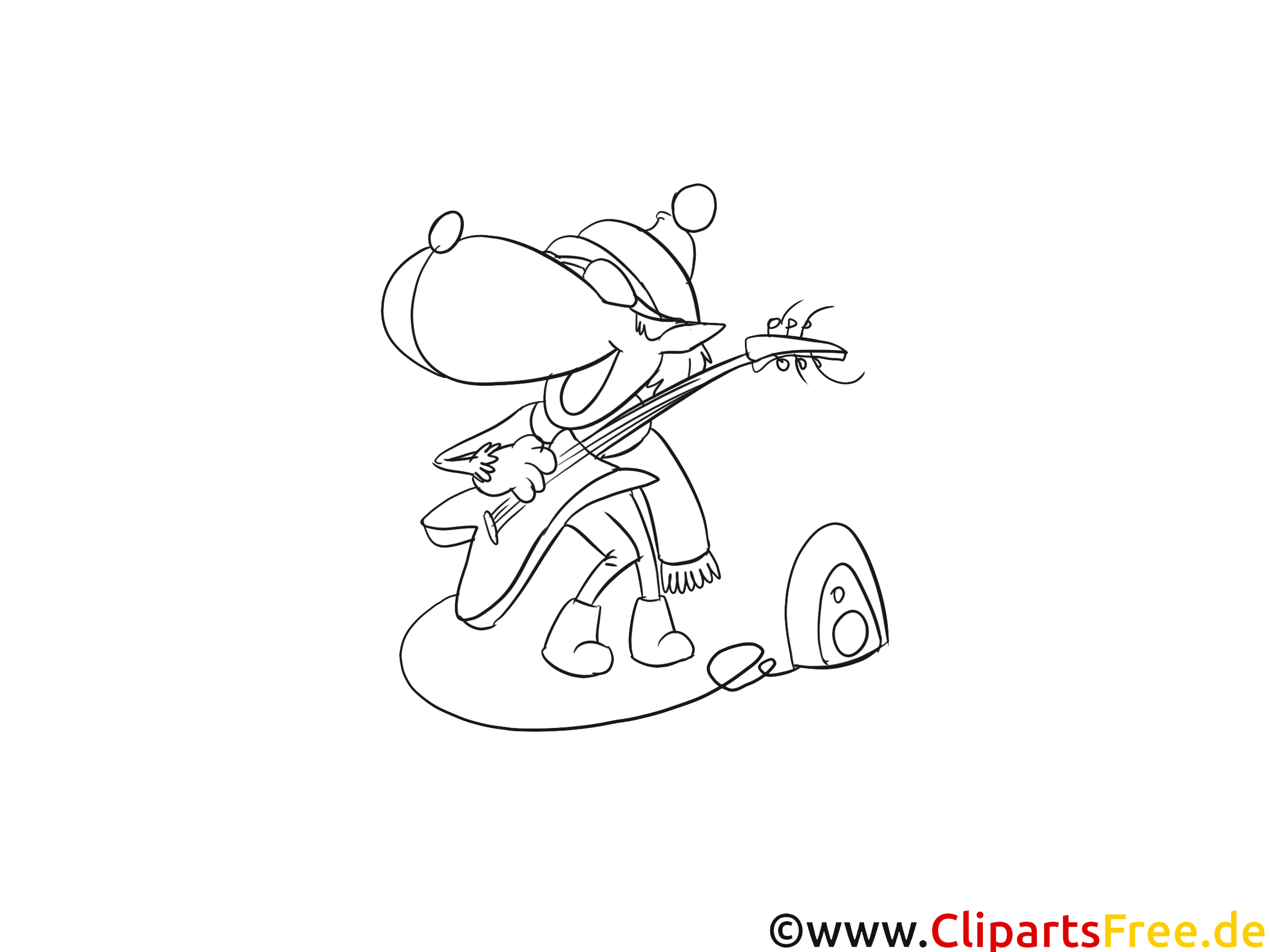 Hier sieht man einen fröhlichen kleinen Charakter, der mit seiner Gitarre rockt! Schaut mal genau hin: die großen Ohren, die knuffige Mütze – das sind schon ganz besondere Details. Irgendwie strahlt das Bild pure Lebensfreude aus, oder? Vielleicht ist es sein erster Auftritt oder er übt einfach nur. Auf dem Boden liegt eine Musikanlage. Eine richtig coole Ausmalvorlage, die sofort gute Laune verbreitet!
