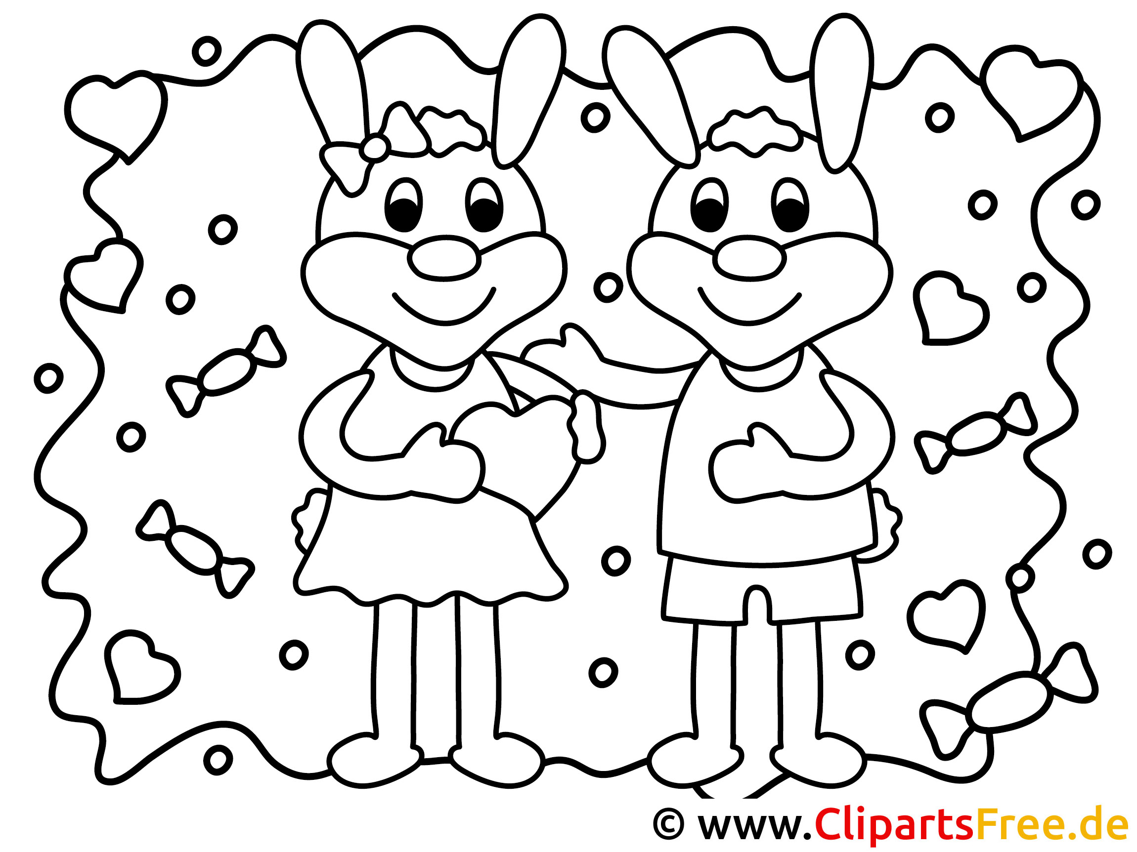 Schau mal! Zwei süße kleine Kaninchen, ja genau! Sie stehen da und lächeln sich an, ganz happy, mit großen, runden Augen. Im Vordergrund halten sie ein kleines Herz, wie süß ist das denn? Um sie herum fliegen herzförmige und bonbonartige Dinge – das gibt dem Bild so eine fröhliche, bunte Note. Die beiden Tierchen sind alles andere als langweilig, die eine hat sogar eine hübsche Schleife im Ohr. Toll, oder? Das Bild ist einfach perfekt zum Ausmalen!