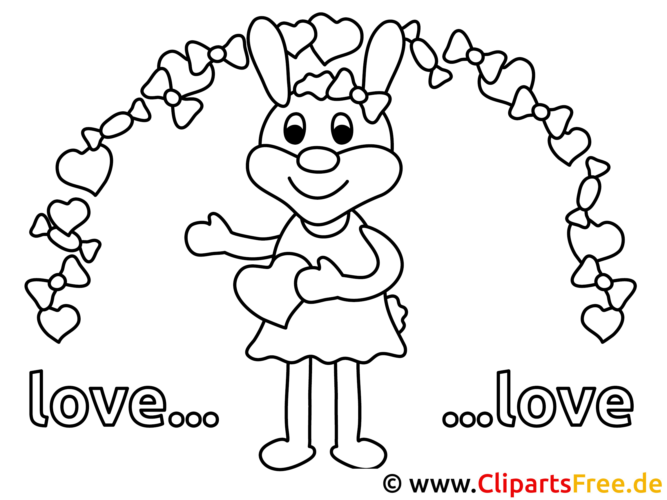 Na, schaut mal! Hier haben wir ein wirklich putziges Bild, das ein fröhliches Kaninchen zeigt. Sie trägt ein hübsches Kleid und hält zwei große Herzen in ihren Pfoten. Über ihrem Kopf sind hübsche Schleifen, die eine ganz zauberhafte Stimmung vermitteln. Und die Schriftzüge „love…love“ fügen sich perfekt in das Bild ein. Irgendwie könnte man sagen, diese Zeichnung strahlt einfach nur Freude aus – genau das Richtige, um Herzen höher schlagen zu lassen–.
