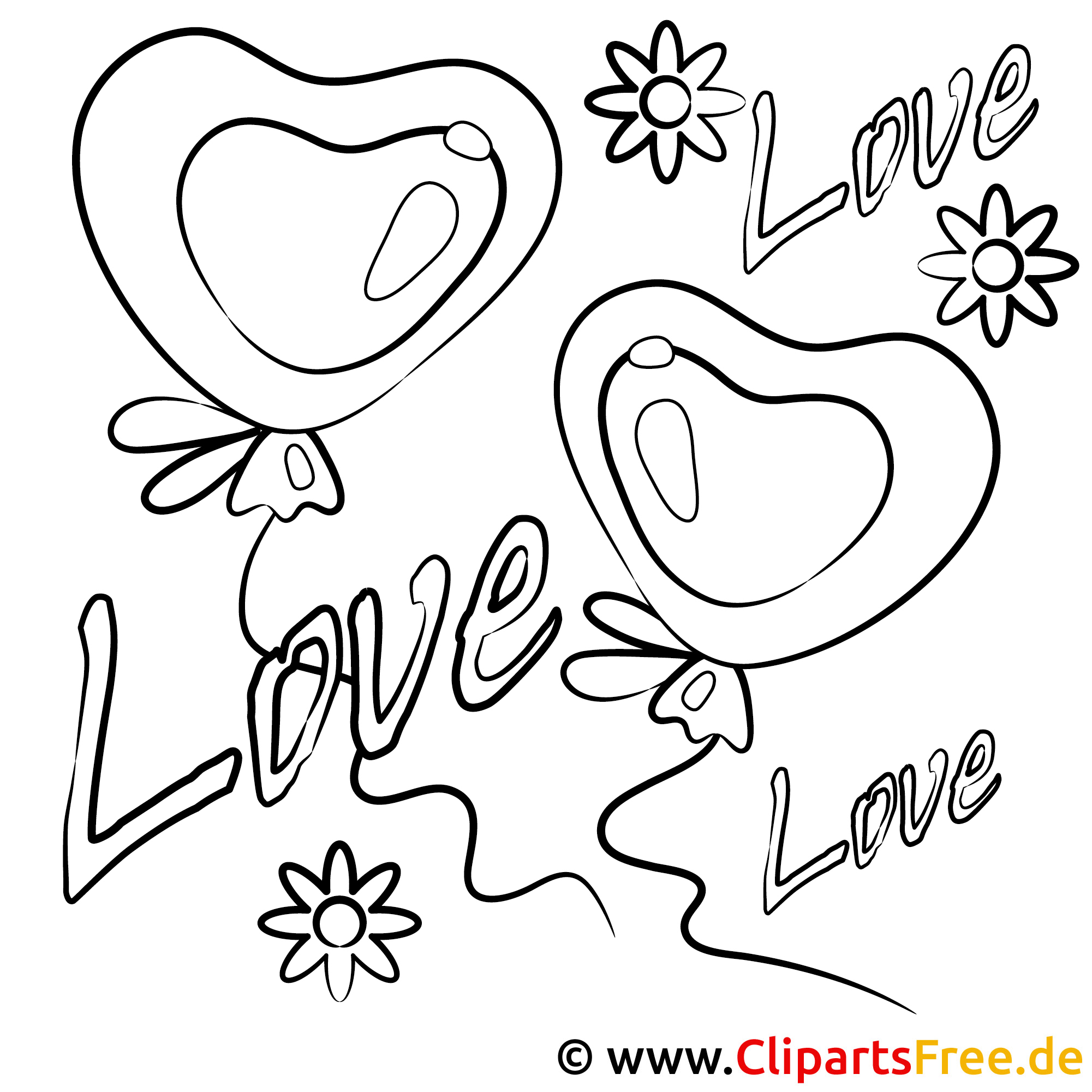Kostenloses Ausmalbild mit Herzluftballons und Blumen im PDF