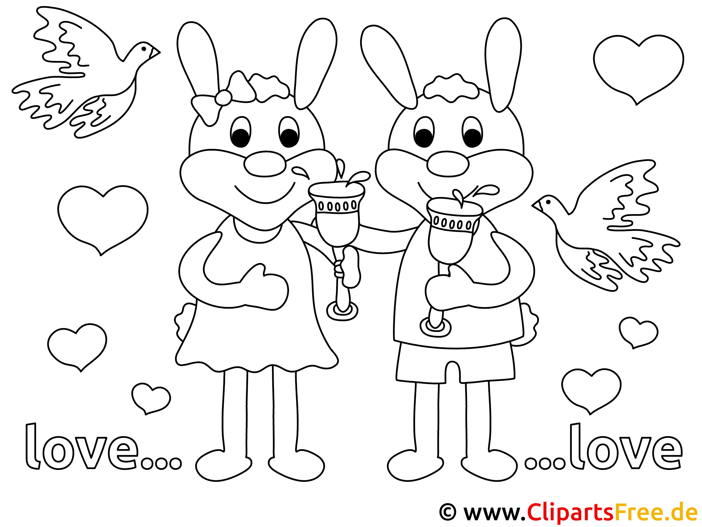 Das Ausmalbild zeigt zwei süße, fröhliche Hasen, die zusammen ein Glas halten. Ganz verliebt schauen sie sich an, während um sie herum Herzen und eine schöne, fliegende Taube kreisen. Die Hasen strahlen pure Freude und Liebe aus. Es ist wirklich ein Bild, das die Herzen erwärmt und tolle Stimmung verbreitet. Ideale Elemente für eine romantische Gelegenheit oder einfach für einen fröhlichen Nachmittag!