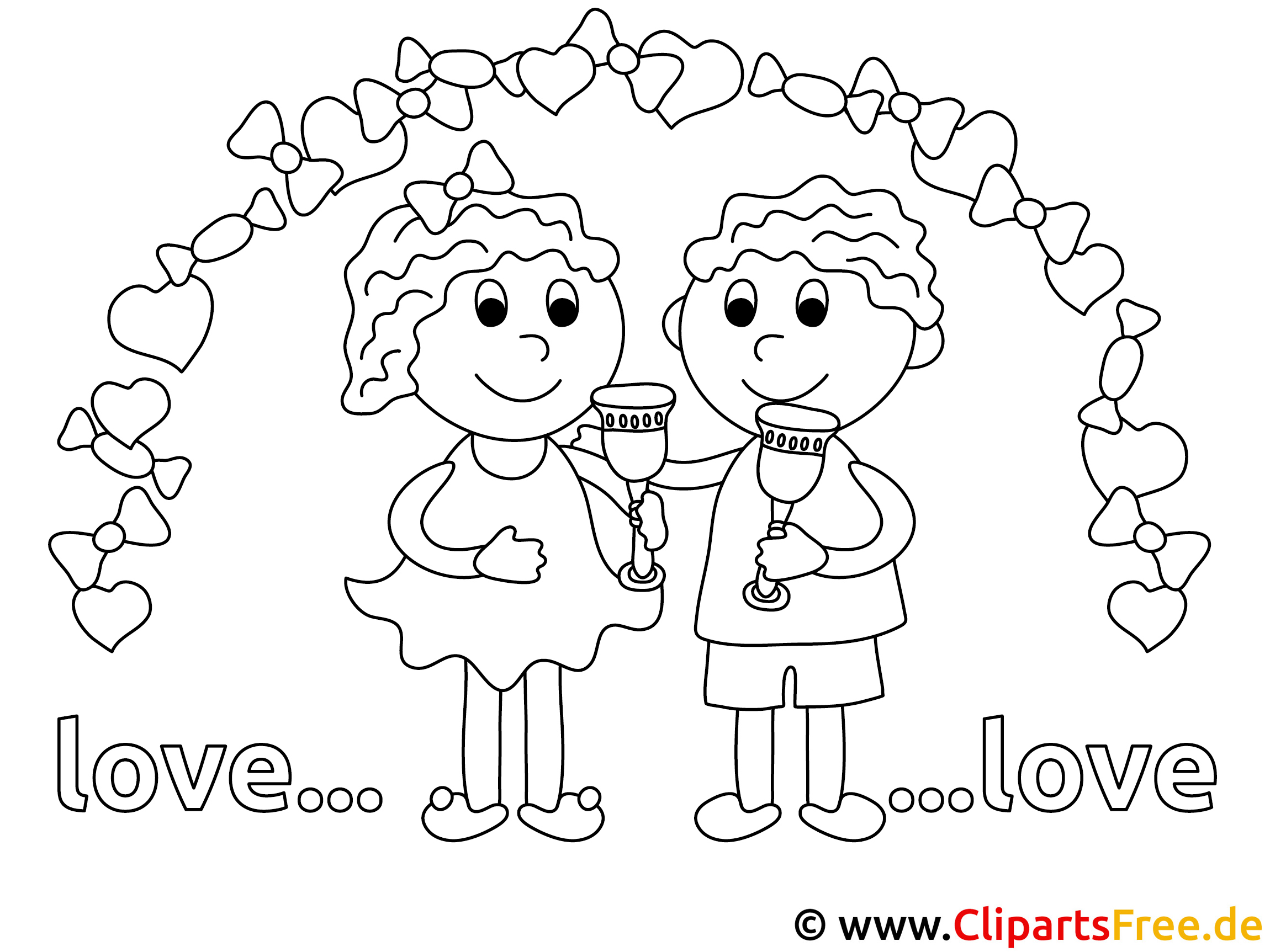 In dieser süßen Malvorlage sieht man zwei freundliche Kinder. Sie stehen nebeneinander und halten kleine Gläser in der Hand – vielleicht ist es ein Toast auf die Freundschaft oder die Liebe? Über ihnen schwebt eine bunte Girlande aus Herzen, ganz zauberhaft! Fühle den Zauber der kindlichen Unschuld; das Bild strahlt eine fröhliche Atmosphäre aus, die gute Laune macht. Die großen, lächelnden Gesichter der beiden zeigen einfach pure Freude. Oben sind die Worte „love…love“ in fröhlicher Schrift zu sehen—das macht das Ganze nicht nur lustig, sondern auch liebevoll!