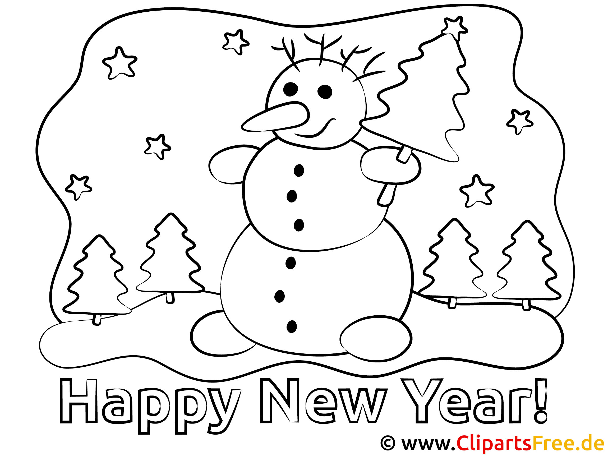 Schau dir dieses fröhliche Ausmalbild an! Ein niedlicher Schneemann steht stolz in einer winterlichen Landschaft. Um ihn herum sind süße, kleine Tannenbäume. Und da sind auch einige funkelnde Sterne am Himmel – wie magisch! Der Schneemann hat eine lustige Karottennase und Augen, die lächeln. Übrigens, auf dem Bild steht "Happy New Year!" – perfekt, um den Jahreswechsel zu feiern. Die Formen sind schön klar und einfach, was das Ausmalen zum Vergnügen macht. weißt du,