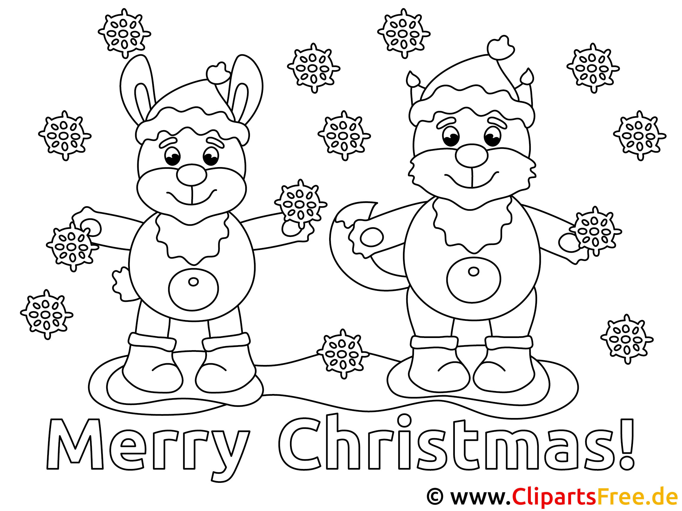 In diesem charmanten Ausmalbild zeigen zwei fröhliche Figuren, die einem Hasen und einem Bären ähneln, ihre winterliche Freude. Die beiden sind gemütlich eingekleidet, klar, die Mütze und der Schal sind unverzichtbar. Um sie herum tanzen kleine Schneeflocken. Dabei strahlen die beiden ihre gute Laune aus, das sieht man an den großen, lächelnden Gesichtern! Oben steht in großen Buchstaben „Merry Christmas!“ – ein herzlicher Gruß, der perfekt in die festliche Jahreszeit passt.