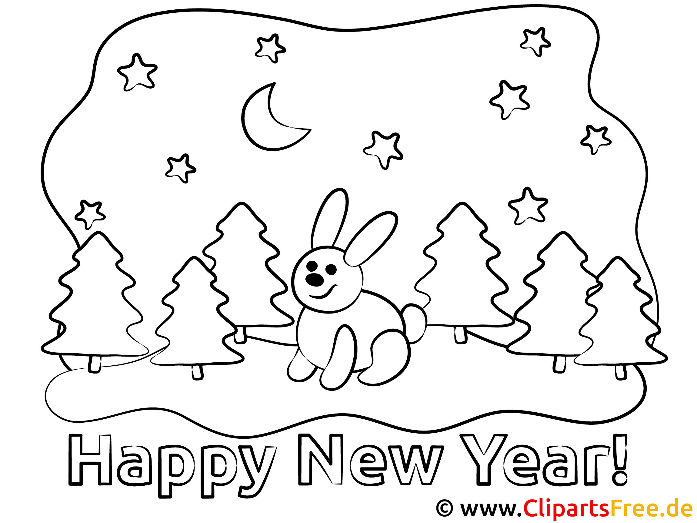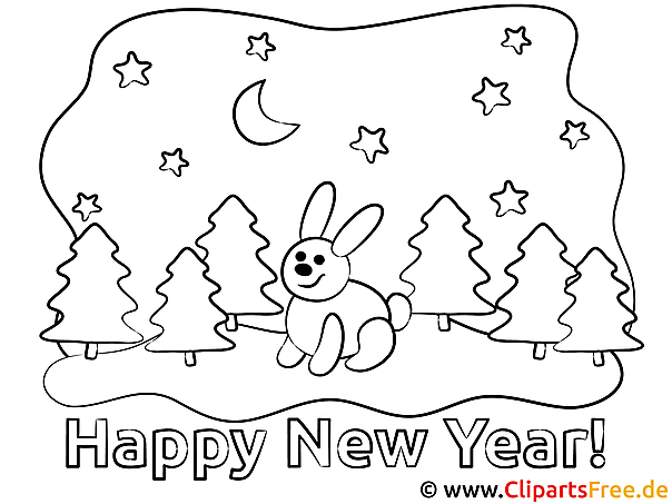 Hier haben wir ein schönes Ausmalbild. Es zeigt einen süßen kleinen Hasen, der ganz fröhlich im Winterwald sitzt. Umgeben von ein paar hübschen Tannenbäumen, gehüllt in eine Sternenbeleuchtung und das sanfte Licht des Mondes. Und oben drüber, die Schrift „Happy New Year!“. Das Bild vermittelt sofort eine festliche Stimmung, oder? Tatsächlich eignet es sich perfekt, um die Vorfreude auf das neue Jahr zu feiern.