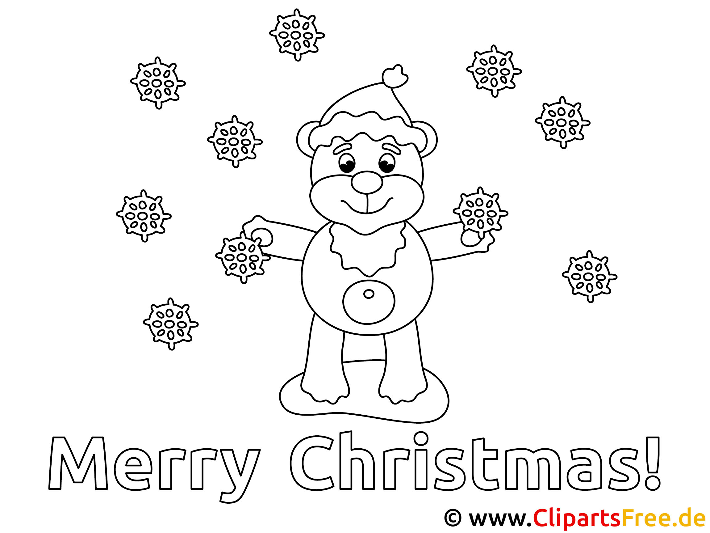 Das Ausmalbild zeigt einen fröhlichen, liebenswerten Bären, der in winterlicher Stimmung einfach bezaubernd ist. Der Bär trägt eine lustige Mütze und hat ein breites Grinsen auf dem Gesicht. Um ihn herum tanzen hübsche Schneekristalle, die die festliche Atmosphäre perfekt unterstreichen. Sie scheinen zu spielen, tänzeln um den Bären und bringen sofort gute Laune. Unten prangt der Schriftzug „Merry Christmas!“, der jedem gefällt und sicher sofort Weihnachtsgefühle weckt.