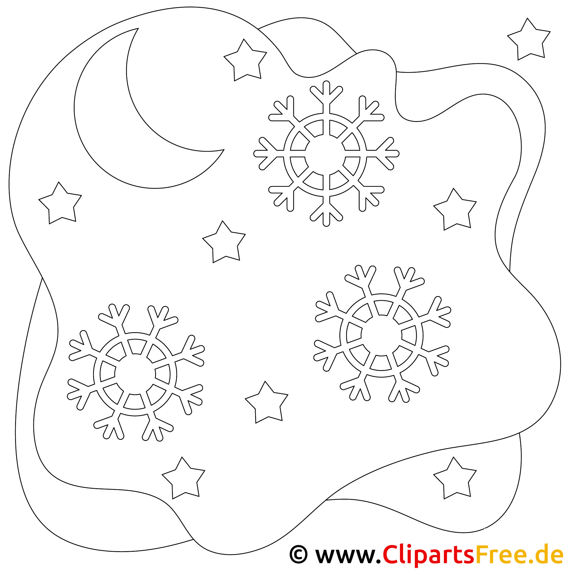 Das Bild zeigt eine zauberhafte Winterlandschaft. Da ist ein großer Blätterhaufen, umgeben von funkensprühenden Schneeflocken, die fröhlich in der Luft schweben. Oben hebt sich ein sanfter Halbmond majestätisch ab. Die kleinen Sterne glitzern und funkeln, als ob sie die Nacht erhellen möchten. Jedes Detail bietet eine Spielwiese für die Fantasie … . Es ist eine perfekte Malvorlage für große und kleine Künstler.