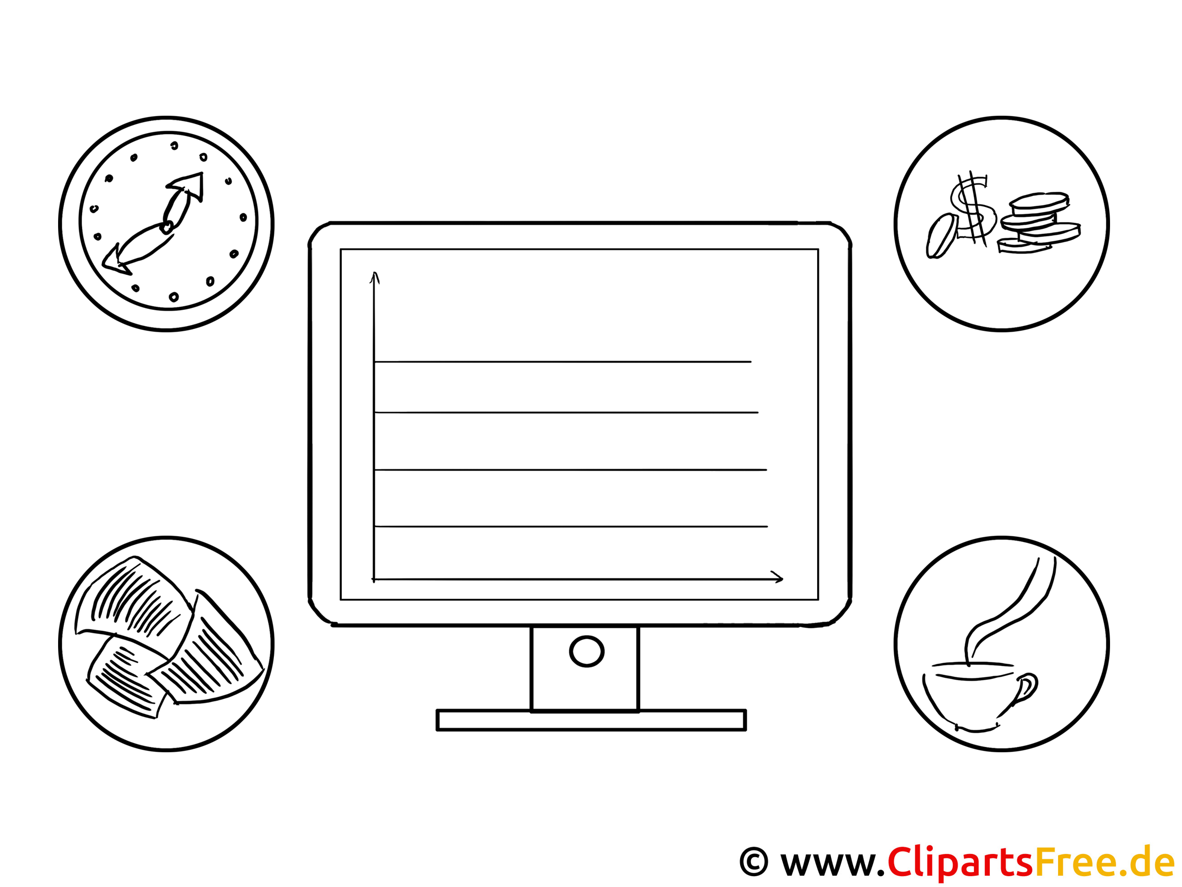 Das Bild zeigt einen Computerbildschirm in der Mitte, der die Zeilen anzeigt – was darauf hinweist, dass hier vielleicht etwas geschrieben oder bearbeitet wird. Drumherum sind kleine, runde Symbole, die verschiedene alltägliche Dinge symbolisieren. Da gibt es ein Zeitmesser, der für die Zeit steht, dann ein Stapel Geldmünzen für Finanzen und eine Kaffeetasse, die sicher für eine Kaffeepause steht. Und natürlich wichtige Unterlagen, die man nicht vergessen darf. Insgesamt wirkt das Bild sehr ansprechend und modern, aber auch ein wenig spielerisch.