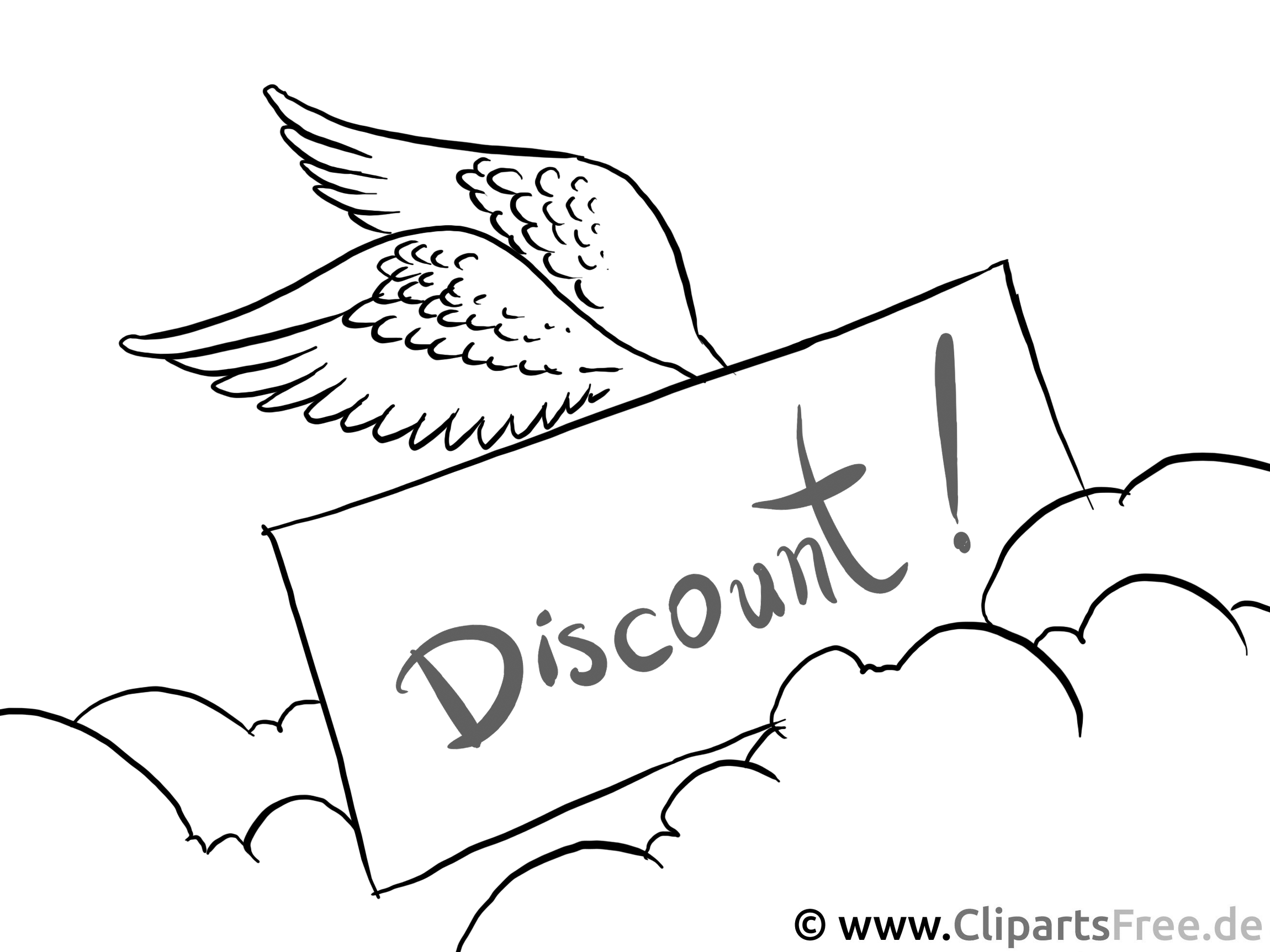 Schau mal, dieses interessante Bild! Ein plakativer Schriftzug „Discount!“ ist da zu entdecken, ganz spannend. Das Ganze wird von einem Engelsflügel eingerahmt – wie eine Botschaft aus der Luft. Die Wolken im Hintergrund geben dem Bild einen traumhaften Touch. Und die Mischung aus Himmel und dem 'Rabatt'-Schild lädt einfach zum Ausmalen ein. Übrigens, die Schwünge des Flügels sind richtig toll, man kann sich vorstellen, wie leicht und elegant der Engel durch die Luft gleitet.