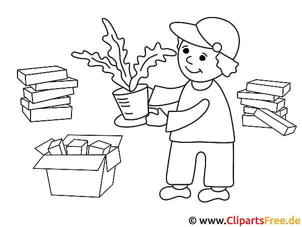 Der Zeichenstil ist ganz kindlich und freundlich–. Durch die klaren, einfachen Linien wird das Bild schön übersichtlich und leicht verständlich–. Die großen Dinge, wie der Pflanztopf und die Kartons, ziehen wirklich die Aufmerksamkeit auf sich. Es lädt zum Ausmalen ein! Durch die unkomplizierten Formen und die spielerische Darstellung können Kinder ihrer Fantasie freien Lauf lassen. Mit vielen bunten Farben könnte das Bild lebendig werden – das wäre echt toll! Die freundliche Mimik des Kindes macht es einfach, eine Verbindung zum Motiv herzustellen und regt dazu an, direkt loszulegen mit dem Malen.