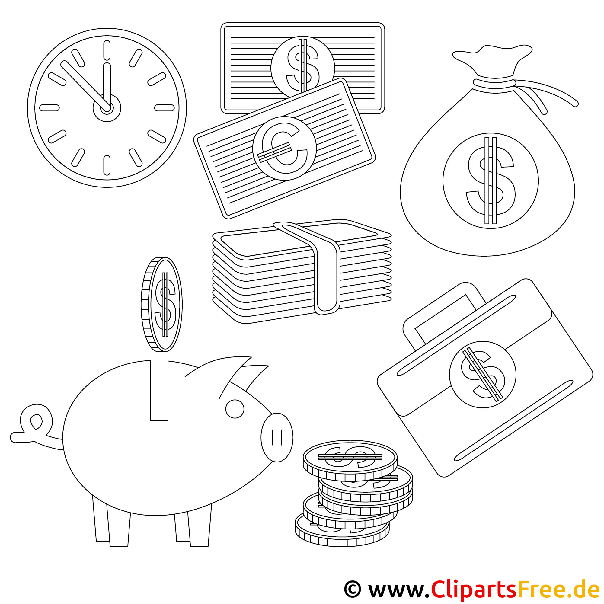 Das Ausmalbild zeigt eine tolle Sammlung von Geldmotiven, die richtig Spaß machen! Da gibt's ein süßes Sparschwein, in das munter eine Münze hineinfällt. Coinstacks, ein Geldsack – und fünf riesige Geldscheine zeigen, wie wichtig das Thema ist. Save und earn! Oh, und ein kleiner Wecker ist natürlich auch dabei, denn Zeit ist Geld, nicht wahr? Diese Bild zum Ausmalen spricht viele Kinder an und regt die Fantasie an.