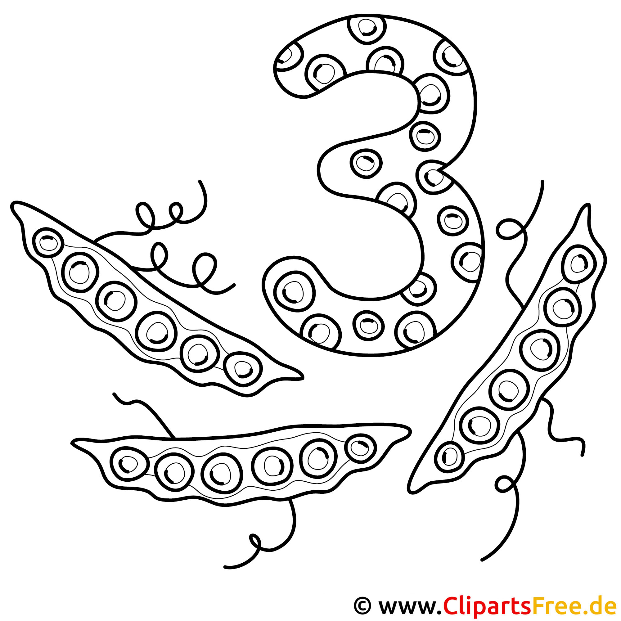 Hier sehen wir ein tolles Bild, das eine ganz besondere Zahl zeigt – die drei! Umrahmt von bunten Erbsenschoten, die miteinander verknüpft sind, wird die Zahl lebendig. Jede dieser Schoten hat kleine Kreise, recht kreativ gezeichnet und lädt dazu ein, sie mit Farben zum Leben zu erwecken. Ein wirklich fröhliches Motiv, das jedem Freude bereiten kann!