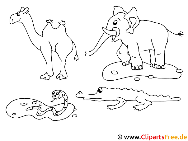 Das Ausmalbild zeigt eine wirklich tolle Zusammenstellung von Tieren! Hier haben wir ein Kamel, das ein bisschen schüchtern wirkt mit seinen zwei Höckern. Daneben steht ein kräftiger Elefant – einfach süß mit seinen großen Ohren und dem langen Rüssel. Und dann ist da noch ein schleimiger Wurm, der ganz gemütlich über einen kleinen Pfad kriecht. Oh, und vergiss den neugierigen Krokodil nicht, das wahrscheinlich nach seinem Mittagessen Ausschau hält. Überall gibt es kleine Details – wie Wasserlachen, in denen die Tiere stehen. Es wird niemals langweilig!