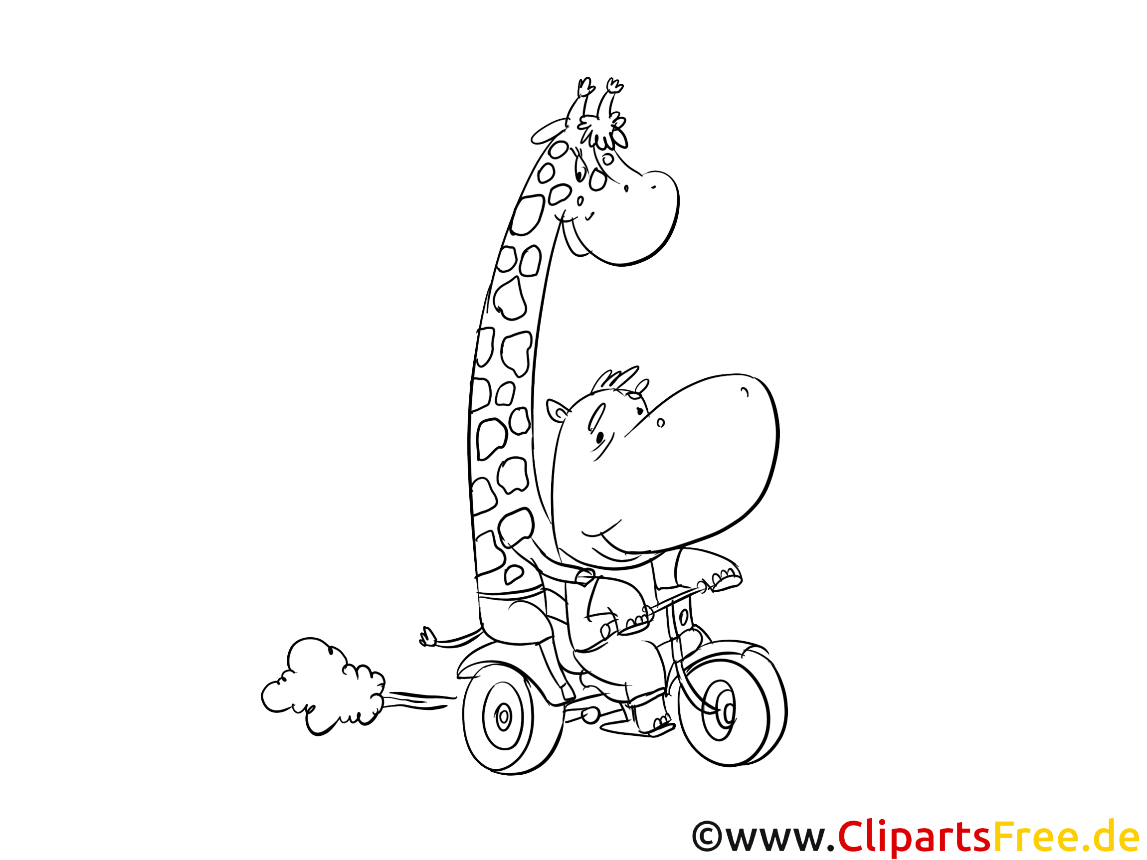 Das Ausmalbild zeigt eine fröhliche Szene mit einer Giraffe und einem Nilpferd. Das Nilpferd fährt auf einem kleinen Fahrrad und hat dabei ein breites, glückliches Lächeln im Gesicht. Die Giraffe sitzt stolz auf dem Rücken des Nilpferds und guckt über dessen Kopf hinweg, was echt süß aussieht. Man sieht jede Menge Details: die großen, freundlichen Augen der Tiere und die lustigen Proportionen. Das Bild vermittelt einfach diese gute Laune, richtig toll für Kinder und auch für ihre Eltern.