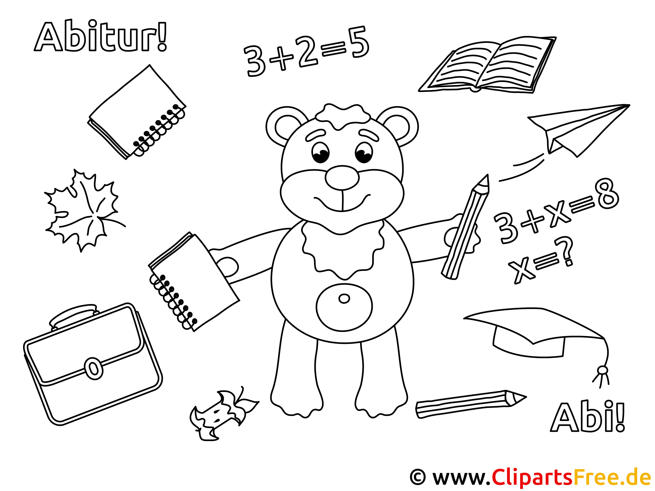 Oh, schau dir dieses süße Bild an! Da ist ein fröhlicher Bär, der mit einem Stift in der Hand dasteht. Er hat ein großes Lächeln und schaut sehr zufrieden aus, als würde er gerade irgendwelche tollen Ideen haben. Um ihn herum sind verschiedene Schulutensilien, wie ein paar Notizbücher und ein Heft, sicher um seine kreative Seele zu fördern. Und schau mal, da ist auch eine kleine Rechnung! 3+2=5, das ist einfach! Und auf der anderen Seite, ach, sind das nicht Fragen? Mathe kann ja schon ganz schön knifflig sein. Das Bild ist wirklich hübsch und einfach perfekt für kleine Künstler, die Spaß am Ausmalen haben!