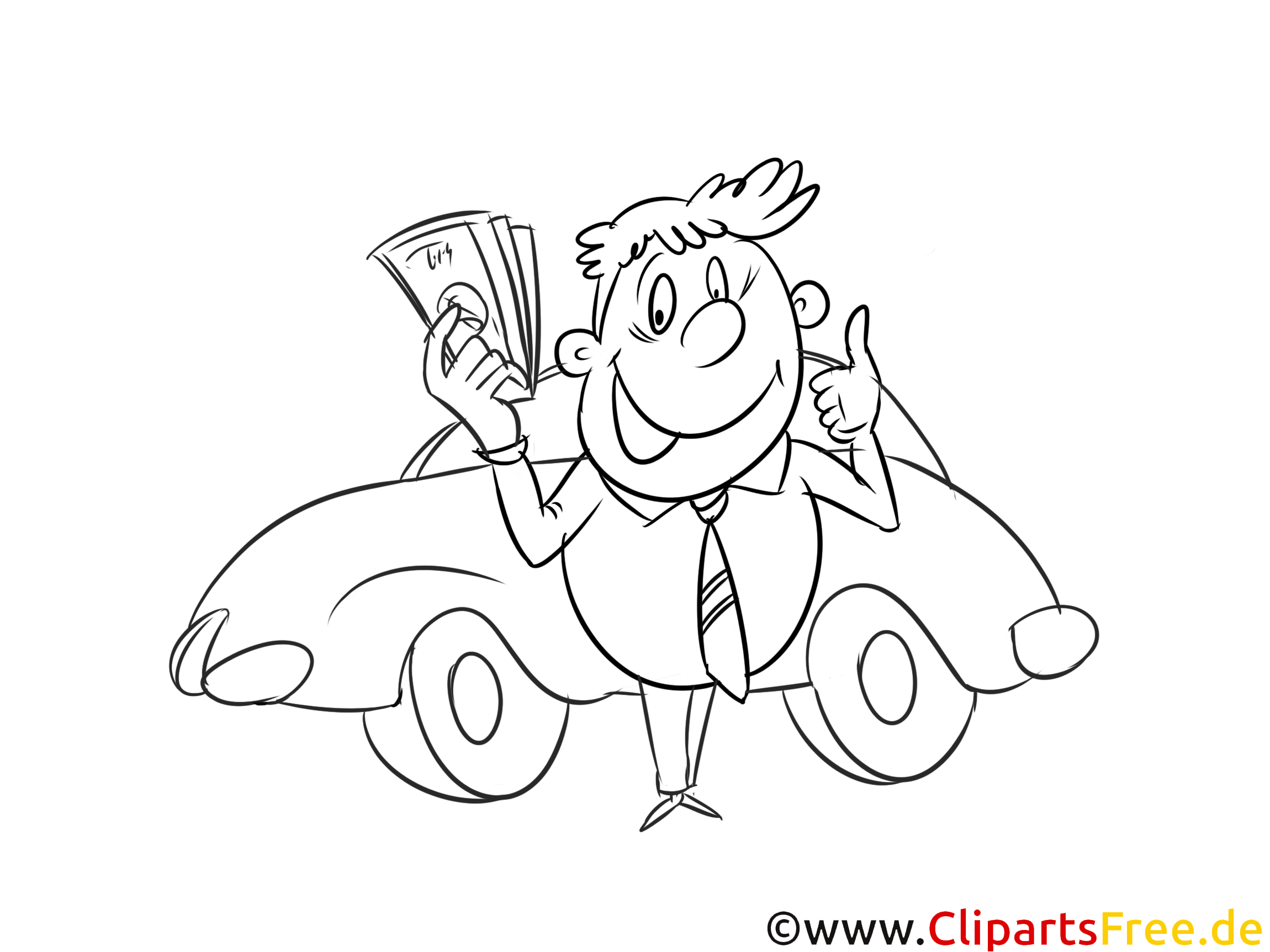 In diesem Ausmalbild sieht man einen fröhlichen, lächelnden Mann in einem schicken Anzug. Er steht neben einem glänzenden roten Auto, das einfach lustig aussieht. In der einen Hand hält er einige Geldscheine und zeigt mit dem anderen Daumen nach oben, als wolle er sagen: "Alles super!" Die Szene strahlt Lebensfreude und auch ein bisschen Abenteuerlust aus, oder? Die Kombination aus dem Auto und dem Geld lässt die Kids sicherlich dazu anregen, eigene Geschichten dazu zu erfinden.