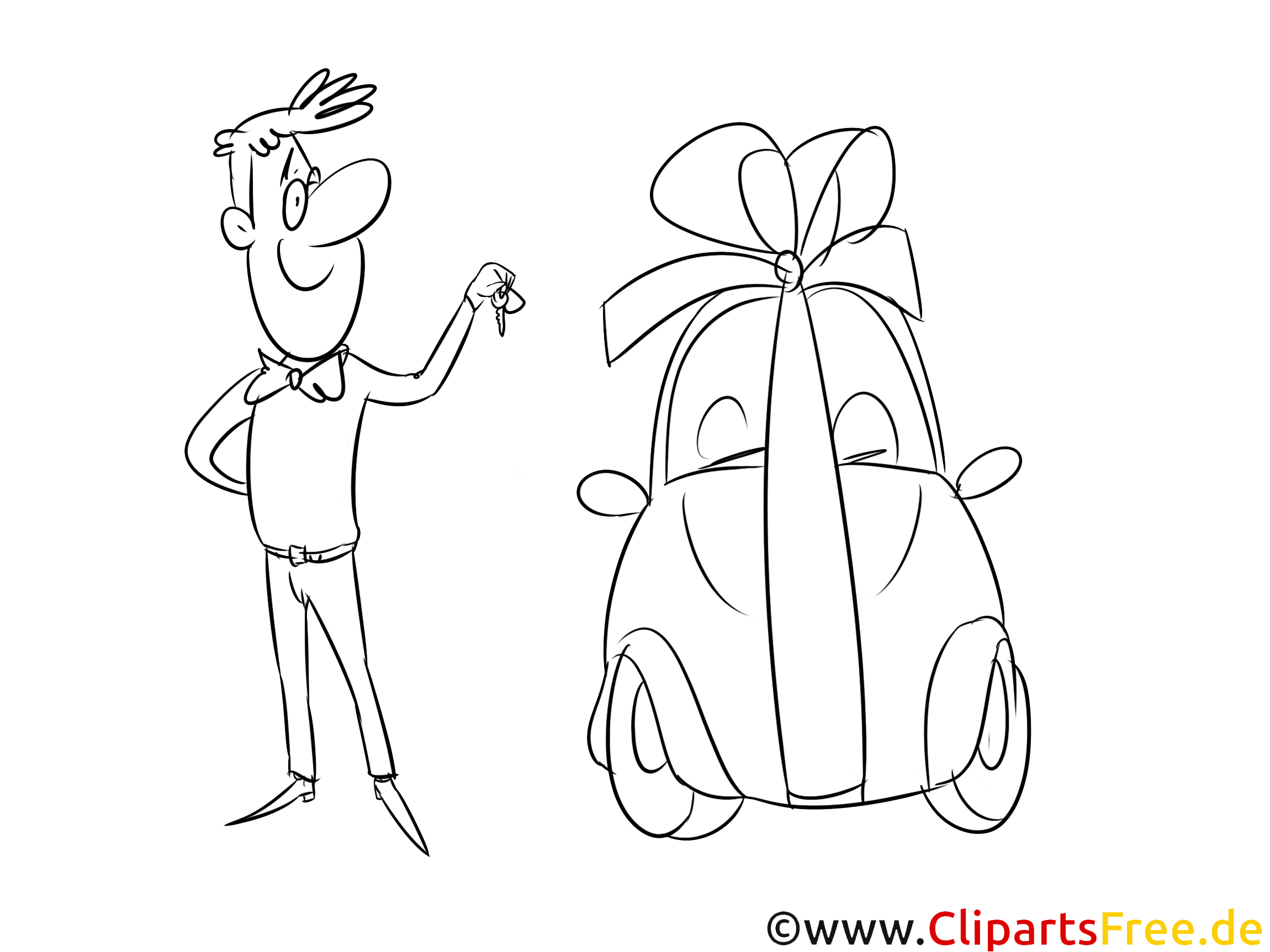 In diesem spannenden Ausmalbild sieht man einen freudestrahlenden Mann, der stolz einen Satz Autoschlüssel in der Hand hält. Na, die Freude über sein neues Auto – kein Wunder, dass er so grinst! Neben ihm steht ein kleines, rundes Auto, das liebevoll mit einem großen Geschenkband geschmückt ist. Ganz transparent, denn ohne Frage ist es ein Geschenk in seiner schönsten Form. Die Szene strahlt puren Optimismus und Glück aus. Ideal für alle kleinen (und großen) Künstler, die das Gefühl von Freude und Überraschung einfangen möchten.