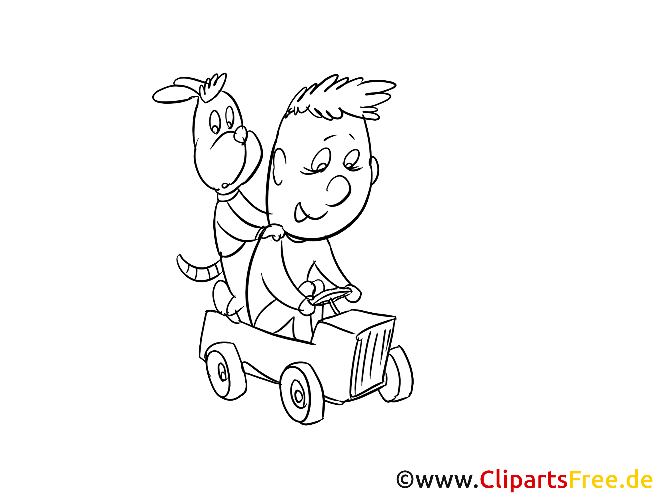 In dieser tollen, bunten Malvorlage sieht man einen kleinen Jungen, der voller Freude in einem Spielzeugauto sitzt. Wow, richtig cool, oder? Hinter ihm steht sein treuer Hund, der, wie es scheint, auch eine Menge Spaß hat. Die beiden wirken wirklich glücklich, und man könnte direkt dazu eingeladen werden, ihre rasante Fahrt mitzumalen! Vielleicht fahren sie gerade auf einem Abenteuer durch den Garten oder über eine Wiese, die nur darauf wartet, lebendig zu werden. Lustige Axt-Haare und große Augen – das Bild strahlt einfach eine Menge Freude aus!
