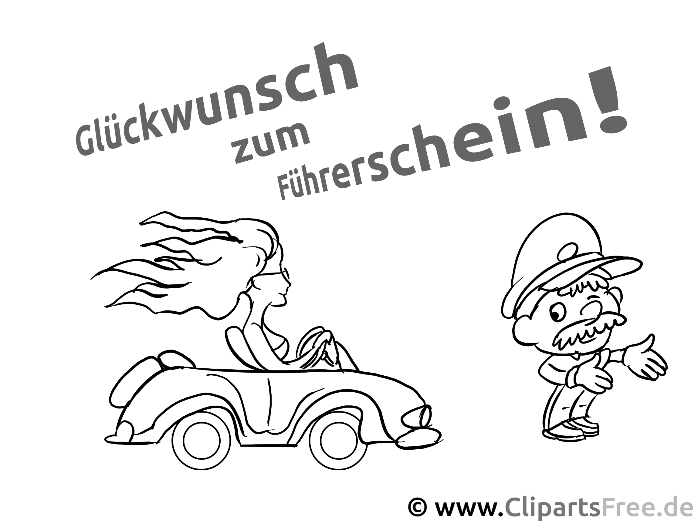 In diesem bezaubernden Ausmalbild sehen wir eine fröhliche Szene. Eine junge Fahrerin – sie hat lange, wehende Haare – cruised in ihrem kleinen, putzigen Auto. Neben ihr steht ein lächelnder Polizist, der ihr begegnet und scheinbar gratuliert. Und naja, da ist auch dieser kraftvolle Schriftzug „Glückwunsch zum Führerschein!“ – so nett! Es strahlt richtig vor Freude und Glück. Perfekt für jeden, der den Führerschein bestanden hat, oder?