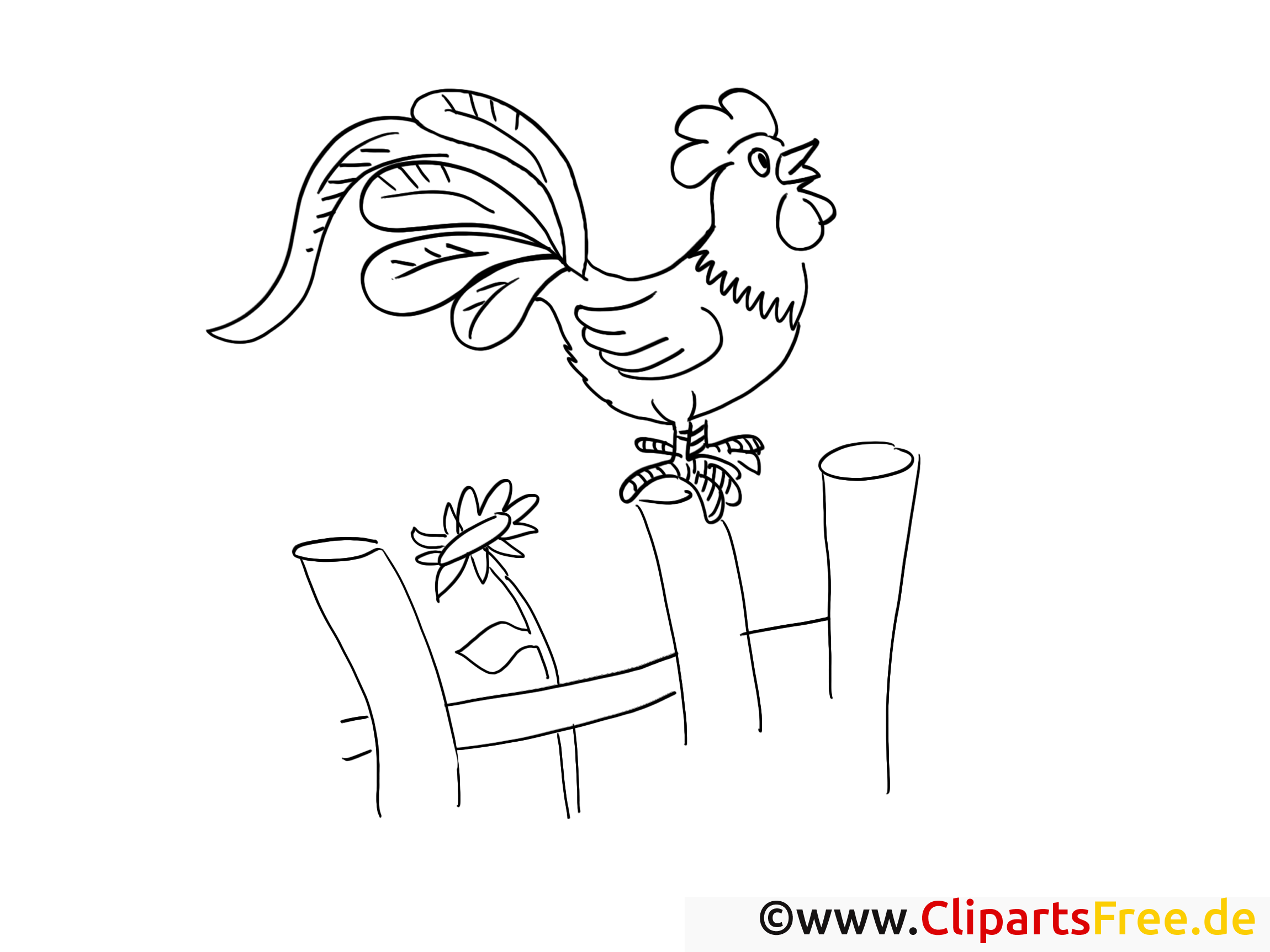 Hahn auf dem Zaun - Morgen auf dem Land - Bilder Malvorlagen gratis